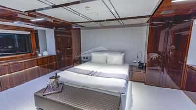 Las cabinas de invitados incluyen una suite principal con cama extragrande y baño privado, 3 camarotes con cama queen size y baño privado y cabina con 2 camas individuales y 1 cama pullman y baño privado.