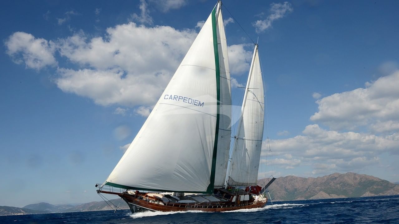 El CARPE DIEM 7 de 98 pies/30 m ha sido construido con un casco de madera y funciona con una velocidad de crucero de 9 nudos y una velocidad máxima de 15 nudos.