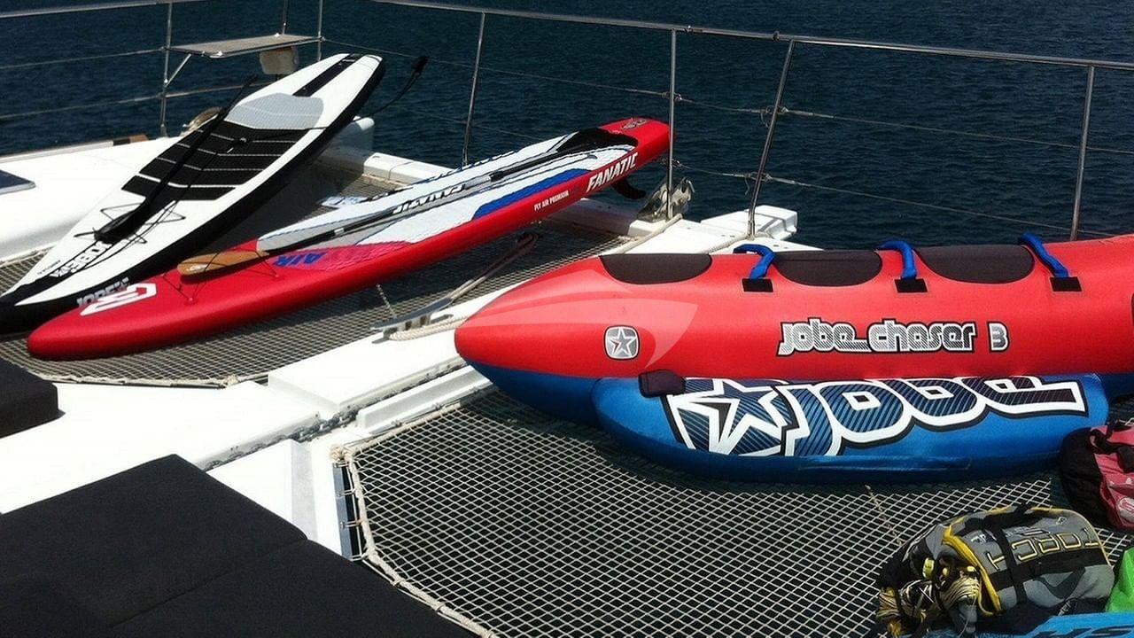 Las comodidades a bordo para los huéspedes del chárter incluyen aire acondicionado, barbacoa, biblioteca, cine, cafetera, ducha exterior, equipo de pesca ligero, máquina de hielo, sistema de audio interior, base para iPod, servidor de películas multimedia, servidor de música MP3, sistema de audio exterior, sombrillas, tumbonas, plataforma de baño, cabina principal de TV, salón de TV, máquina de agua y Wi-Fi.