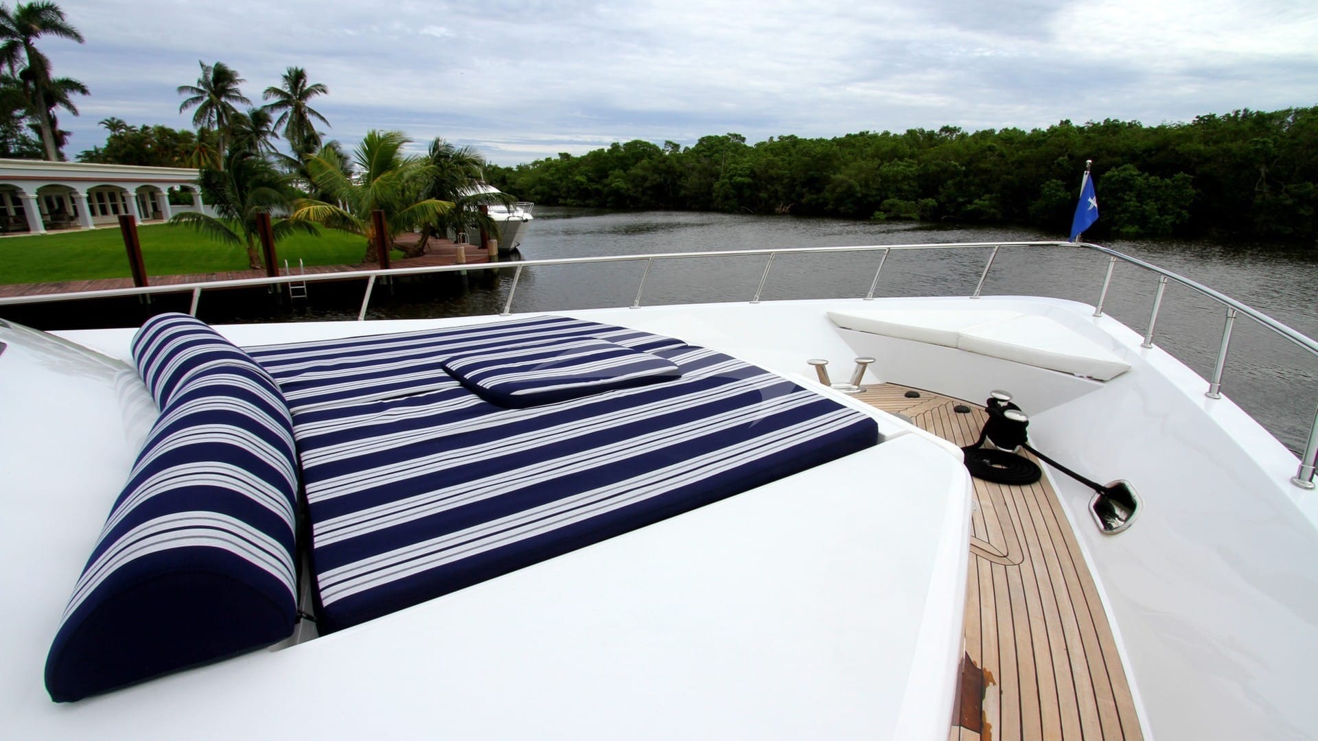 Las comodidades a bordo incluyen aire acondicionado, barbacoa, cafetera, ducha exterior, equipo de pesca de caza mayor, equipo de pesca ligero, sistema de audio interior, jacuzzi en la cabina principal, sistema de audio exterior, TV vía satélite, dietas especiales, estabilizadores, protectores solares, tumbonas, plataforma de baño, TV en todas las cabinas, salón de TV, máquina de agua y Wi-Fi.