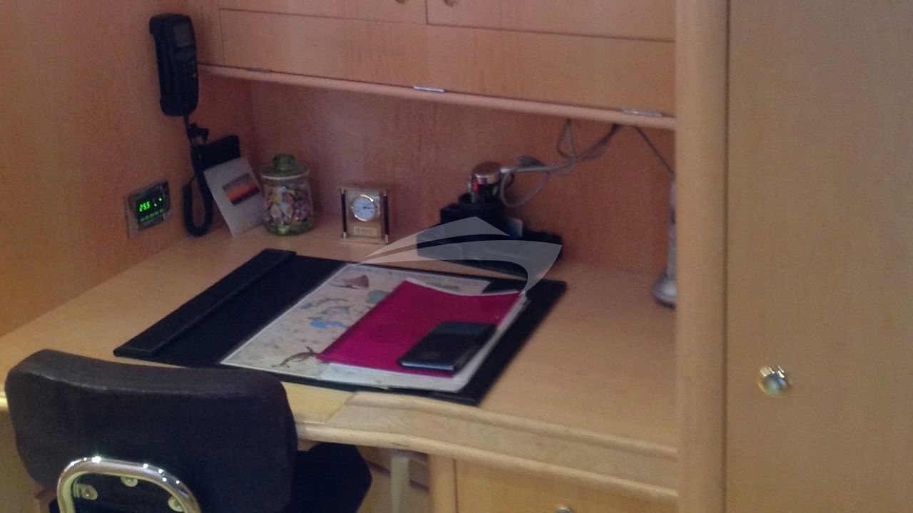 Las comodidades a bordo incluyen aire acondicionado, barbacoa, cafetera, ducha exterior, máquina de hielo, sistema de audio interior, servidor de música MP3, cabina principal de TV, salón de TV y máquina de agua.