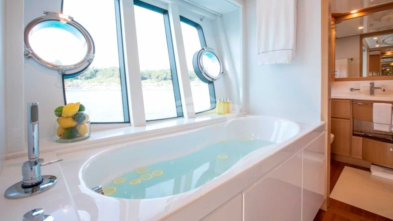 Las comodidades a bordo incluyen aire acondicionado, estabilizadores en el anclaje, protectores solares, plataforma de baño y Wi-Fi.