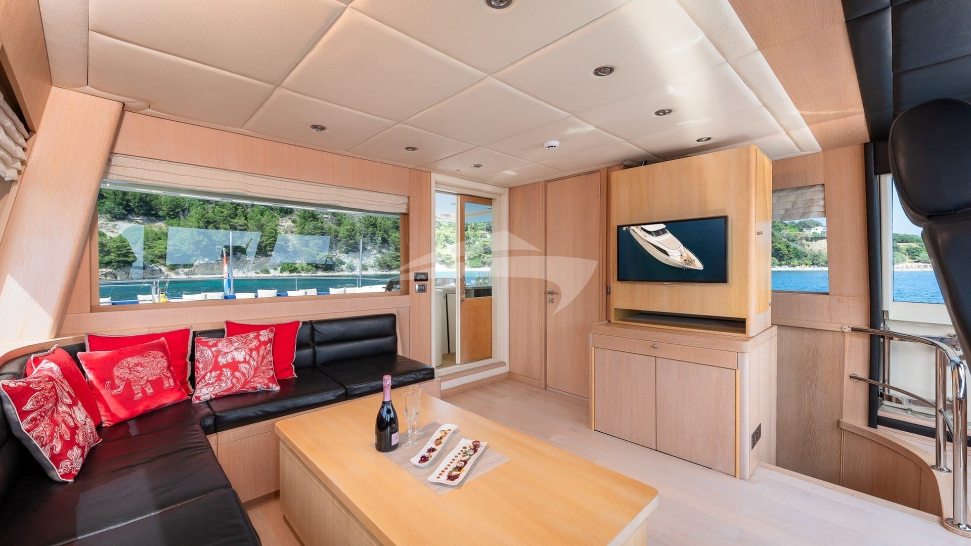 Las comodidades a bordo para los huéspedes del chárter incluyen equipo de pesca ligera, sistema de audio interior, cabina principal de TV y salón de TV.
