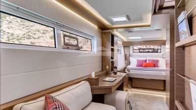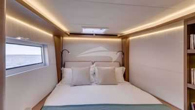 Le SEA IO peut accueillir 6 personnes dans 3 cabines comprenant une suite principale avec un lit queen-size et une salle de bains privative, une cabine avec un lit queen-size et une salle de bains privative et une cabine avec un lit double.