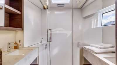 Les équipements à bord incluent la climatisation, une douche extérieure, un système audio intérieur, une plateforme de bain, un salon de télévision et une connexion Wi-Fi.