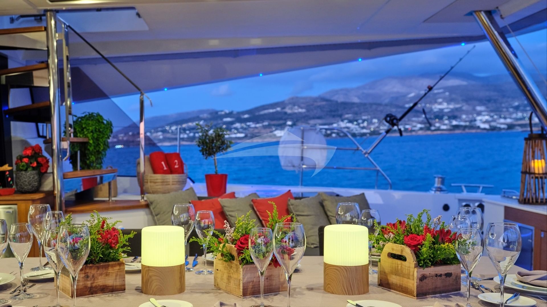 Les équipements à bord pour les clients de la location incluent la climatisation, un barbecue, du matériel de pêche léger, une machine à glaçons, un système audio extérieur, des coussins solaires, une plateforme de bain, une télévision dans toutes les cabines et un salon de télévision.
