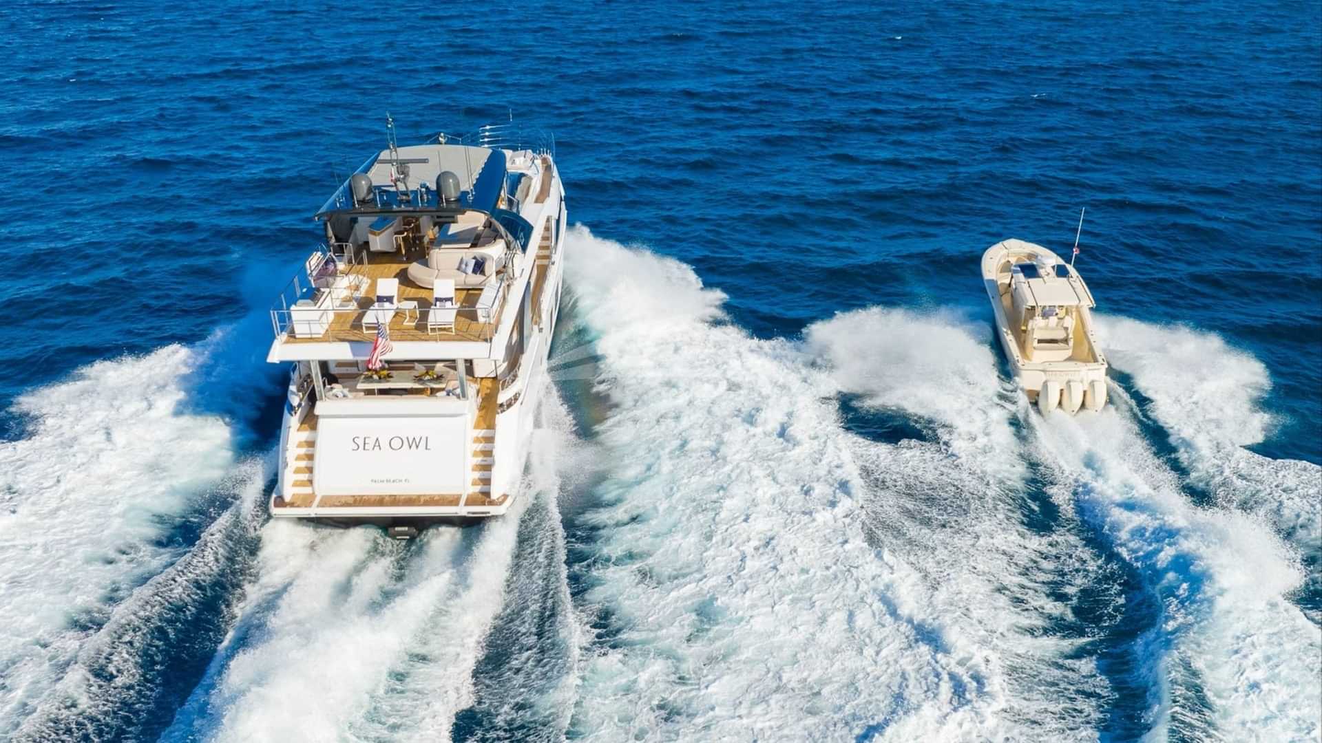 TenderCockpit HelmGuest BathroomMaster BathroomBridgeSwim Platform and Sea BobsSun LoungersAerial ViewDeck Seating and Outdoor BarBeach ClubInteriorGuest CabinForedeck SeatingMain SalonGuest CabinSwim Platform and Water ToysGuest BathroomSea Owl and TenderTwin CabinMaster CabinInteriorSwim Platform and Water ToysDeck DiningDeck Dining