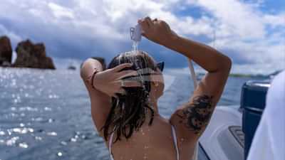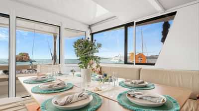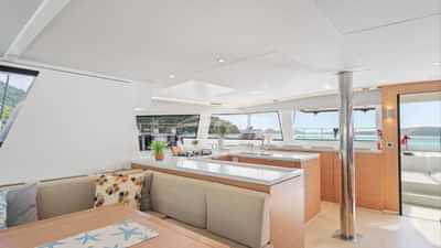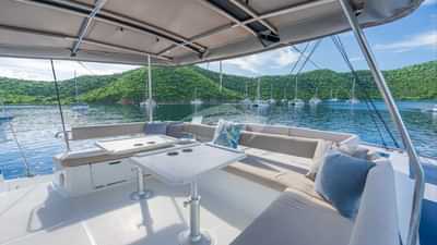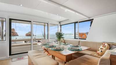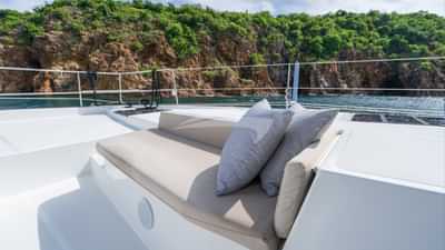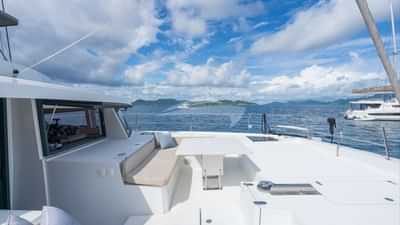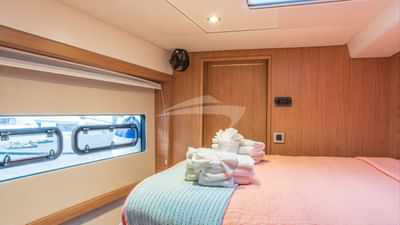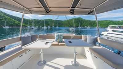 Les équipements à bord pour les clients de la location incluent la climatisation, un barbecue, une machine à café, une douche extérieure, du matériel de pêche léger, des sièges sur le pont avant, une table pour s'asseoir sur le pont avant, une plateforme de bain hydraulique, un système audio intérieur, un accès Internet par satellite Starlink, des coussins solaires, un dessalinisateur et le Wi-Fi.