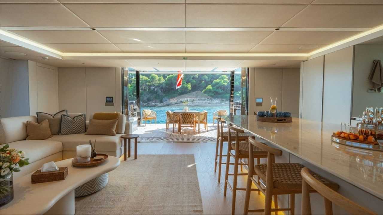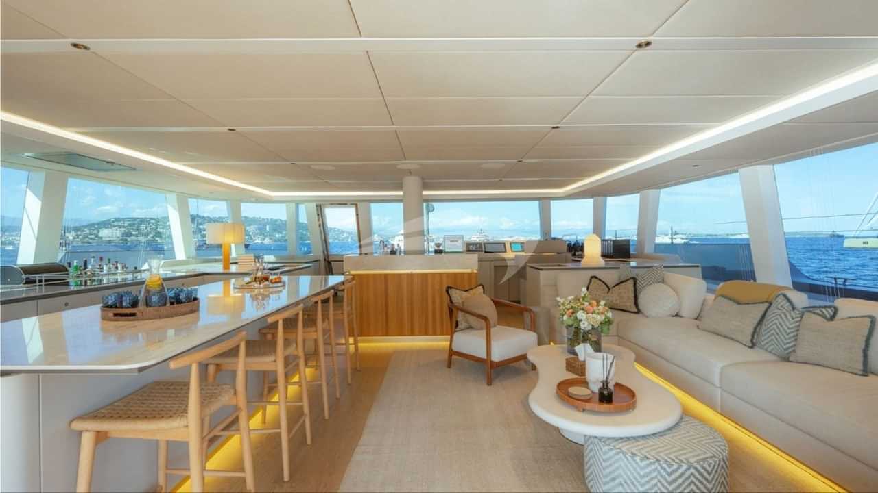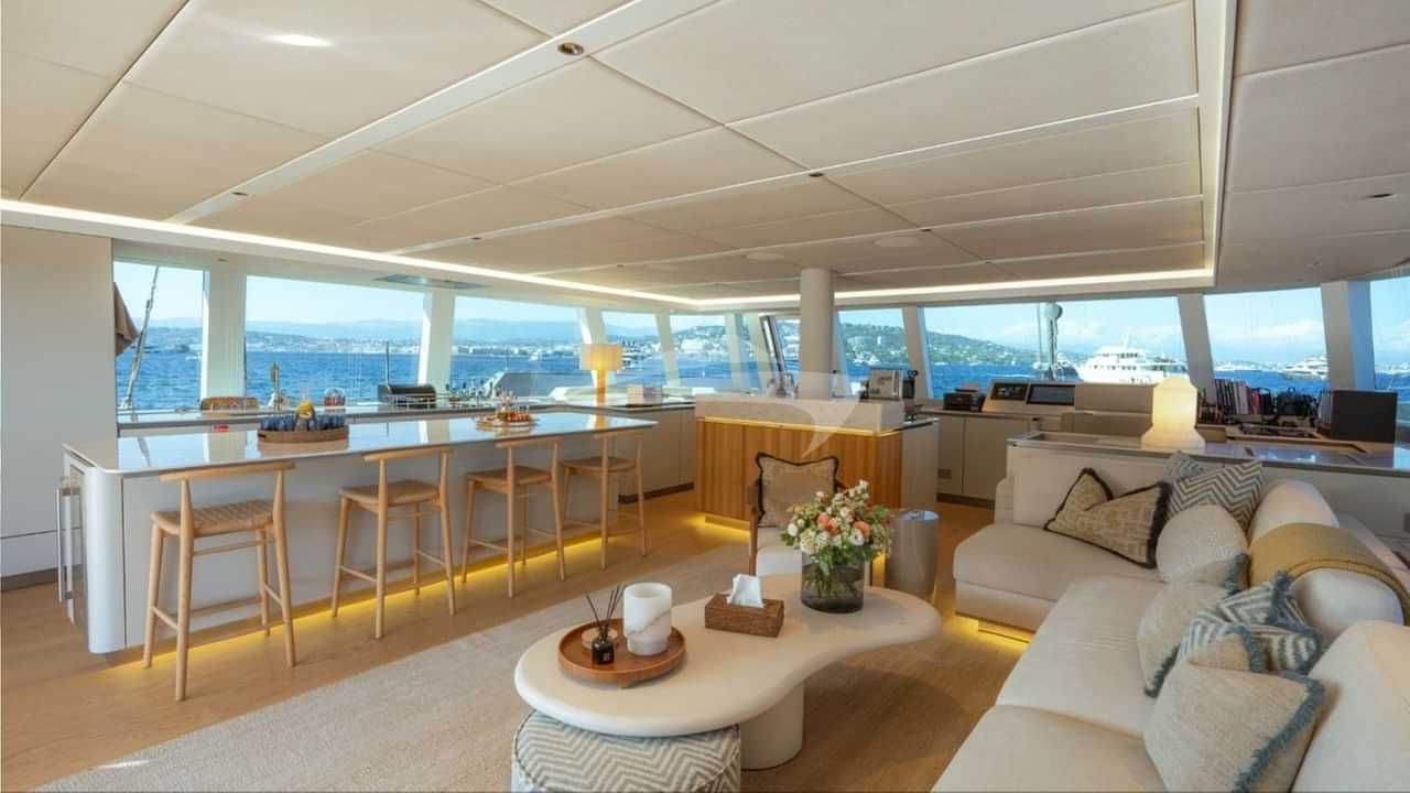 Les équipements à bord pour les clients de la location incluent des équipements de sport, un système audio intérieur, un cinéma en plein air, une cabine de télévision principale, un salon de télévision et une connexion Wi-Fi.