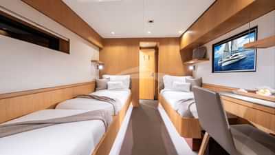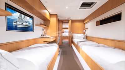 Les cabines d'hôtes comprennent une suite principale avec un lit king size et une salle de bains privative, 2 cabines avec un lit double et une salle de bains privative et une cabine avec 3 lits simples et salle de bains privative.