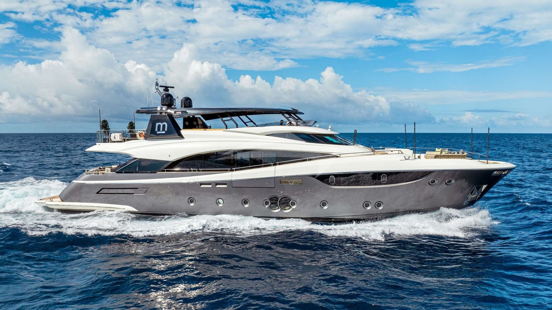 Le M de 105 pieds/32 m a été construit avec une coque en fibre de verre et est propulsé par des moteurs diesel MTU 16V 2000 M93 de 2/400 ch avec une vitesse de croisière de 23 nœuds et une vitesse maximale de 27 nœuds.
