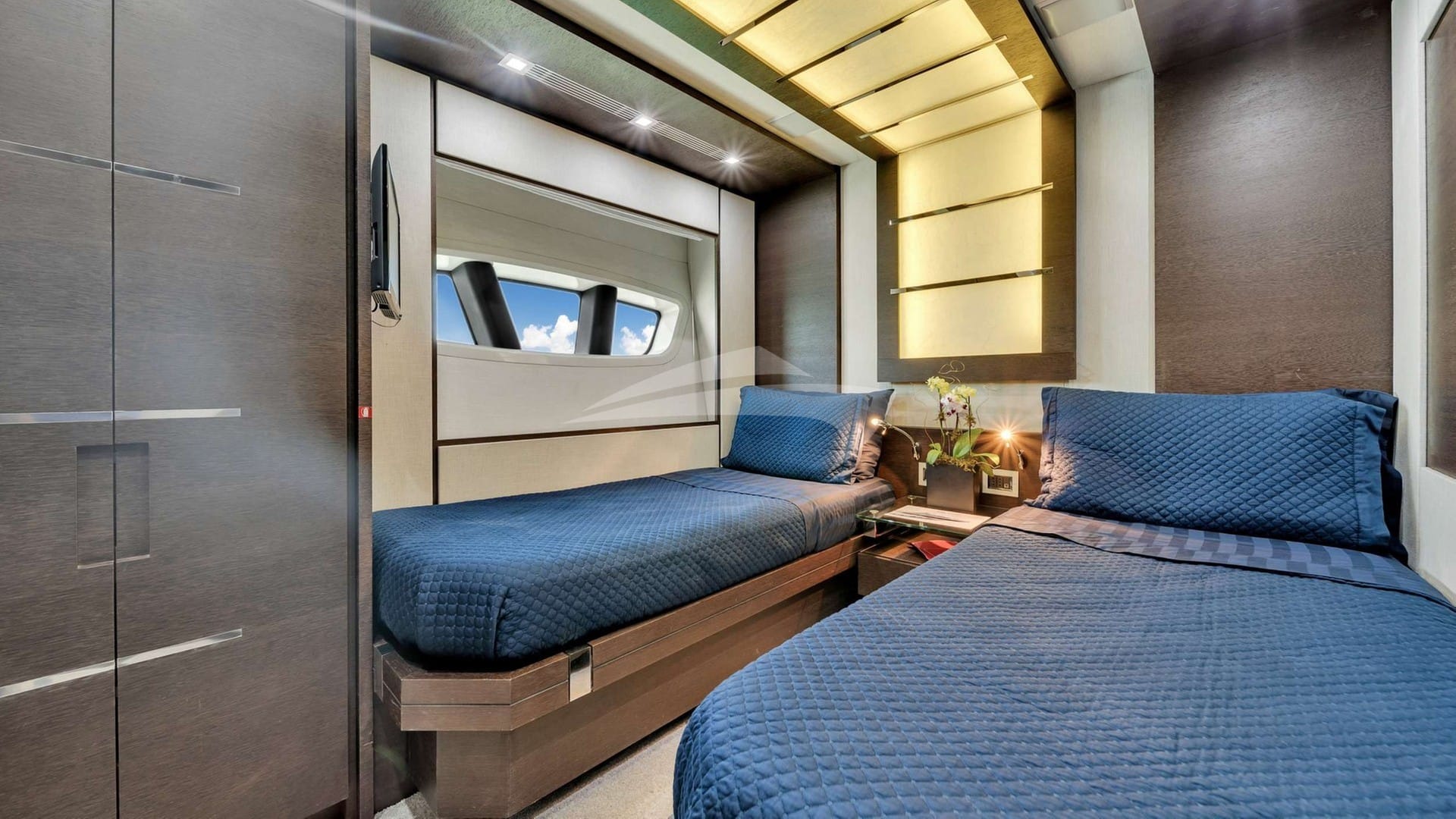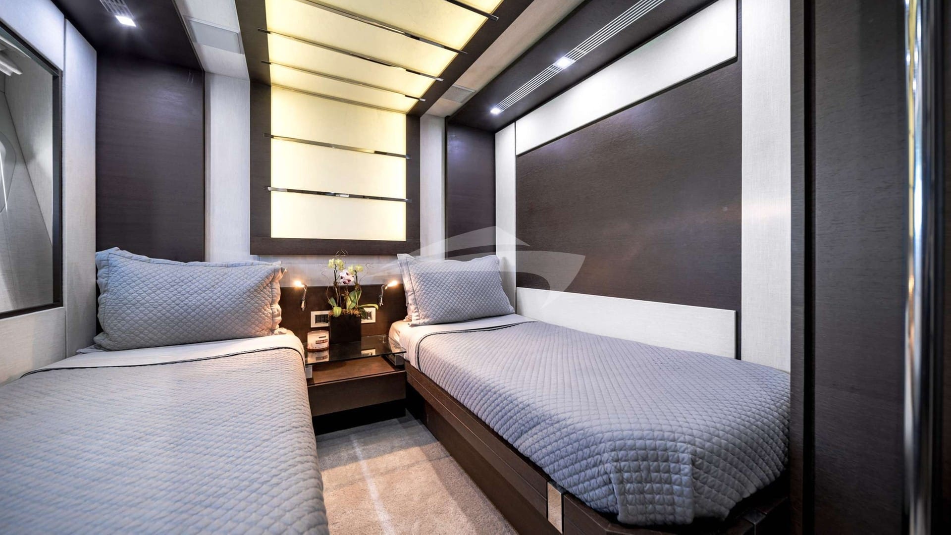 Les cabines comprennent une suite principale avec un lit king-size et une salle de bains privative, une cabine avec un lit double et une salle de bains privative, ainsi que 2 cabines avec un lit double et une salle de bains privative.