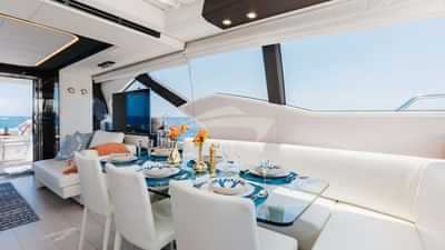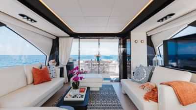 Les équipements à bord pour les clients de la location incluent la climatisation, un barbecue, un système audio intérieur, une station d'accueil pour iPod, des stabilisateurs au mouillage, une plateforme de bain, un salon de télévision et une connexion Wi-Fi.
