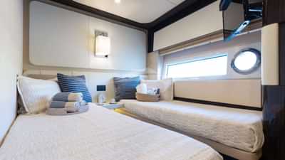 Les cabines comprennent une suite principale avec un lit king-size et une salle de bains privative, une cabine avec un lit queen-size et un lit pullman et une salle de bains privative, ainsi que 2 cabines avec un lit double et une salle de bains privative.