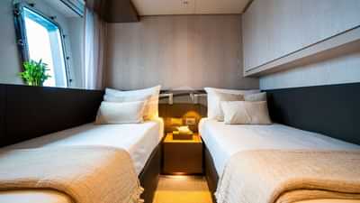 Les cabines d'hôtes comprennent une suite principale avec un lit king size et un lit Pullman et une salle de bains privative, 2 cabines avec un lit queen-size et une salle de bains privative et 4 cabines avec un lit simple.