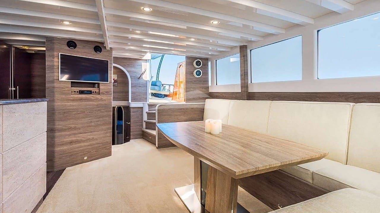Les équipements à bord incluent la climatisation, un système audio intérieur et un salon de télévision.