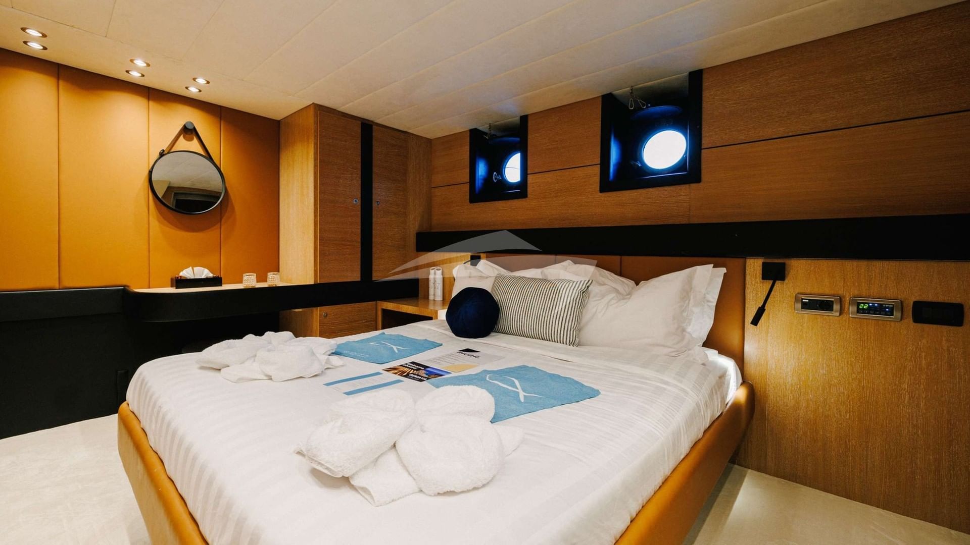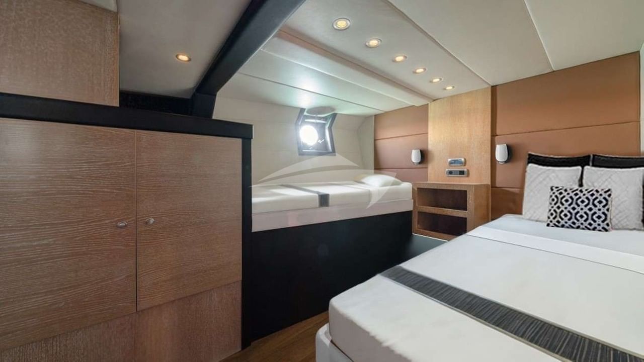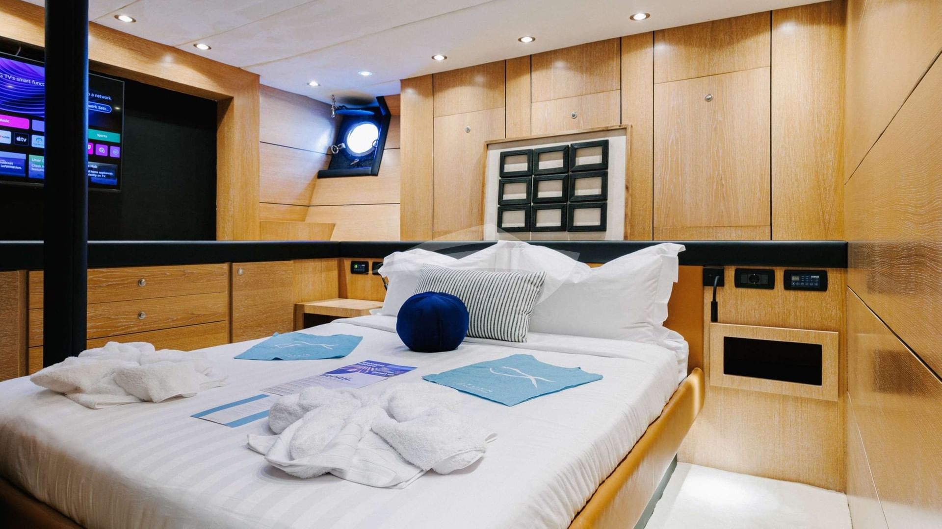Les cabines comprennent une suite principale avec un lit double et une salle de bains privative, 3 cabines avec un lit double et une salle de bains privative, ainsi qu'une cabine avec un lit double et une salle de bains privative.