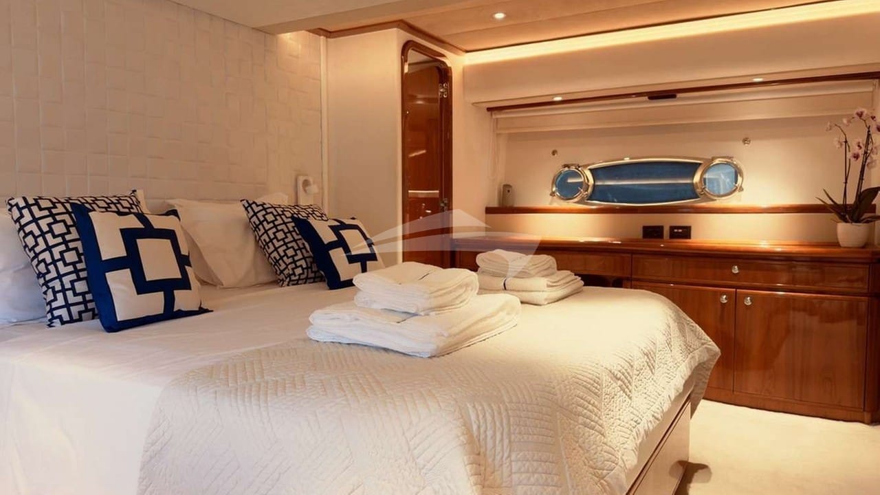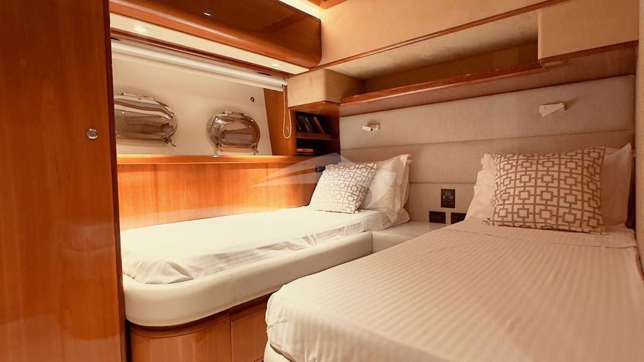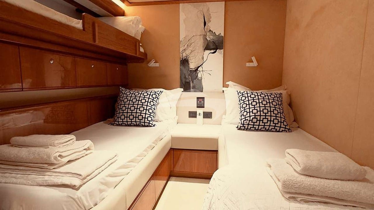 Les cabines d'hôtes comprennent une suite principale avec un lit double, une cabine avec un lit double et un lit Pullman et 2 cabines avec un lit double.
