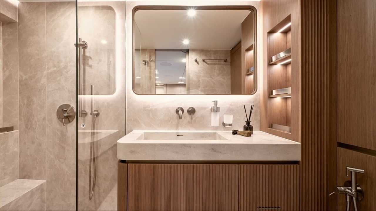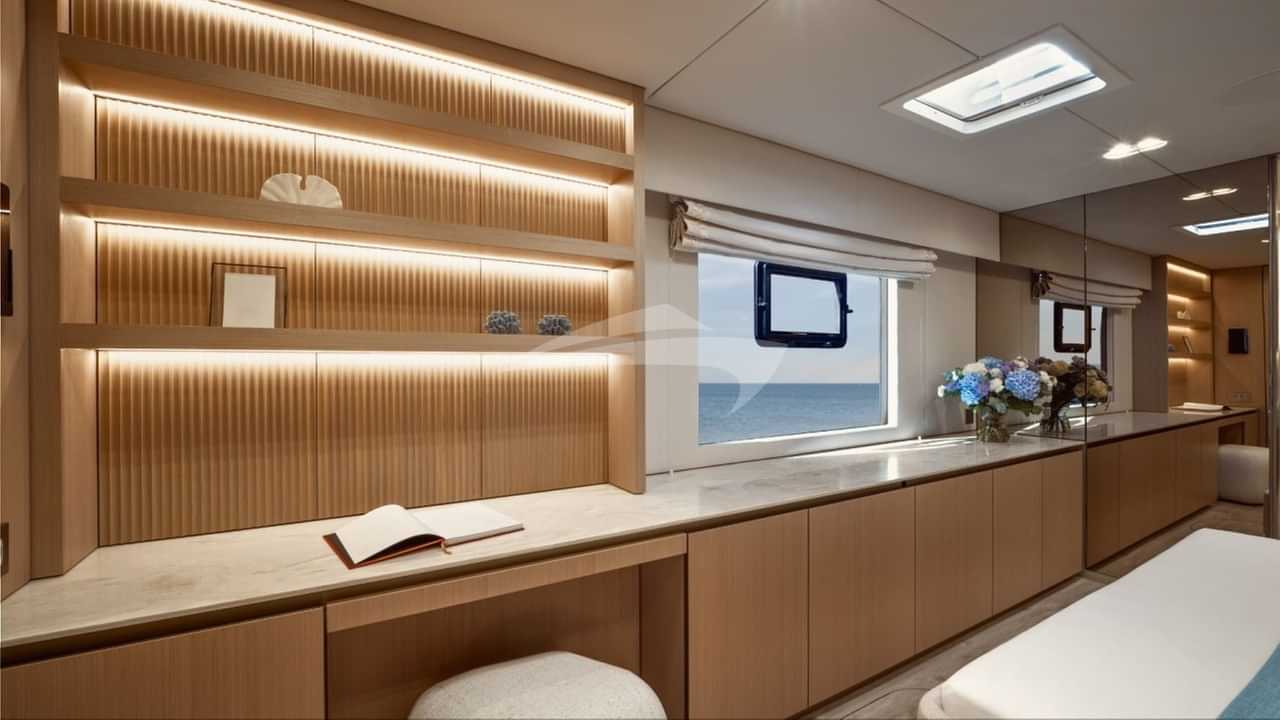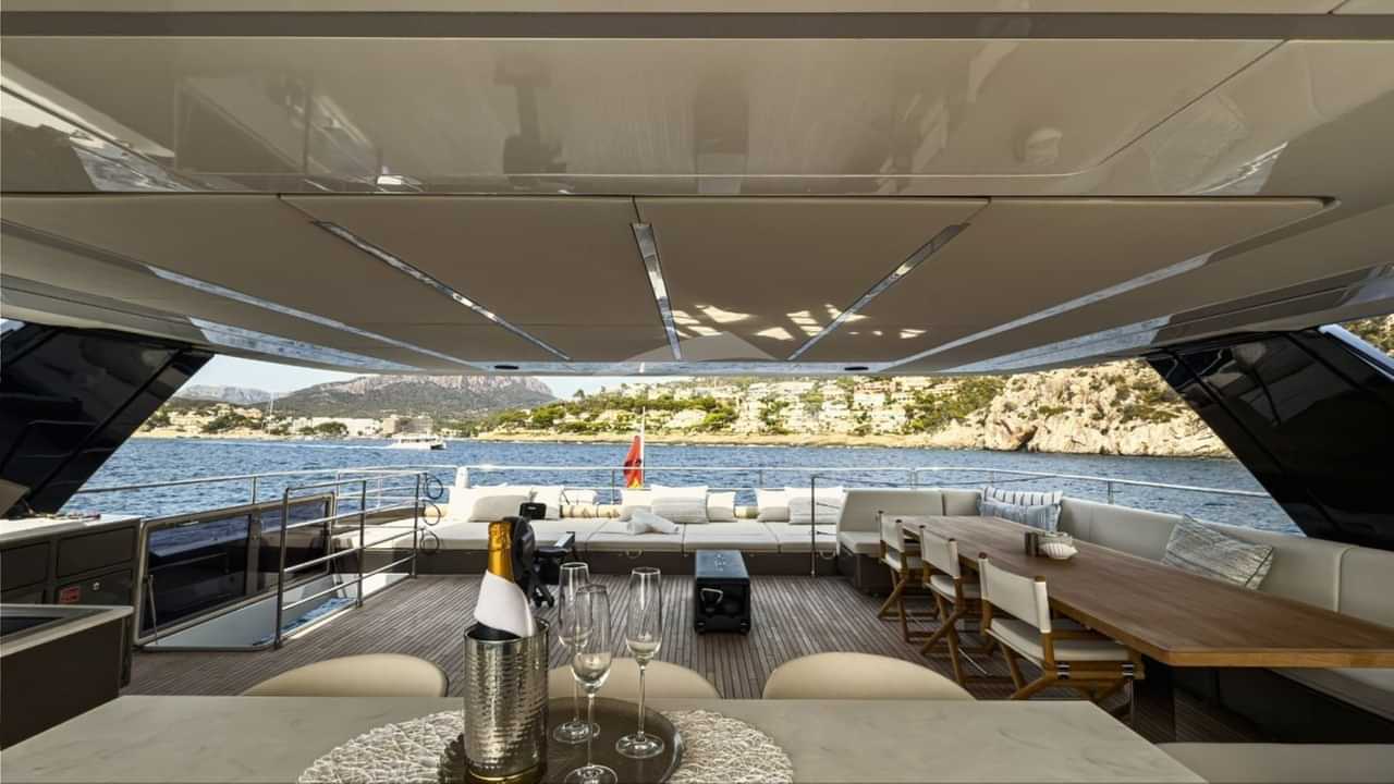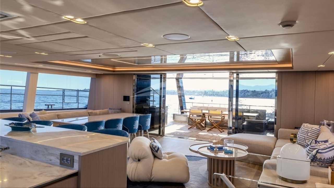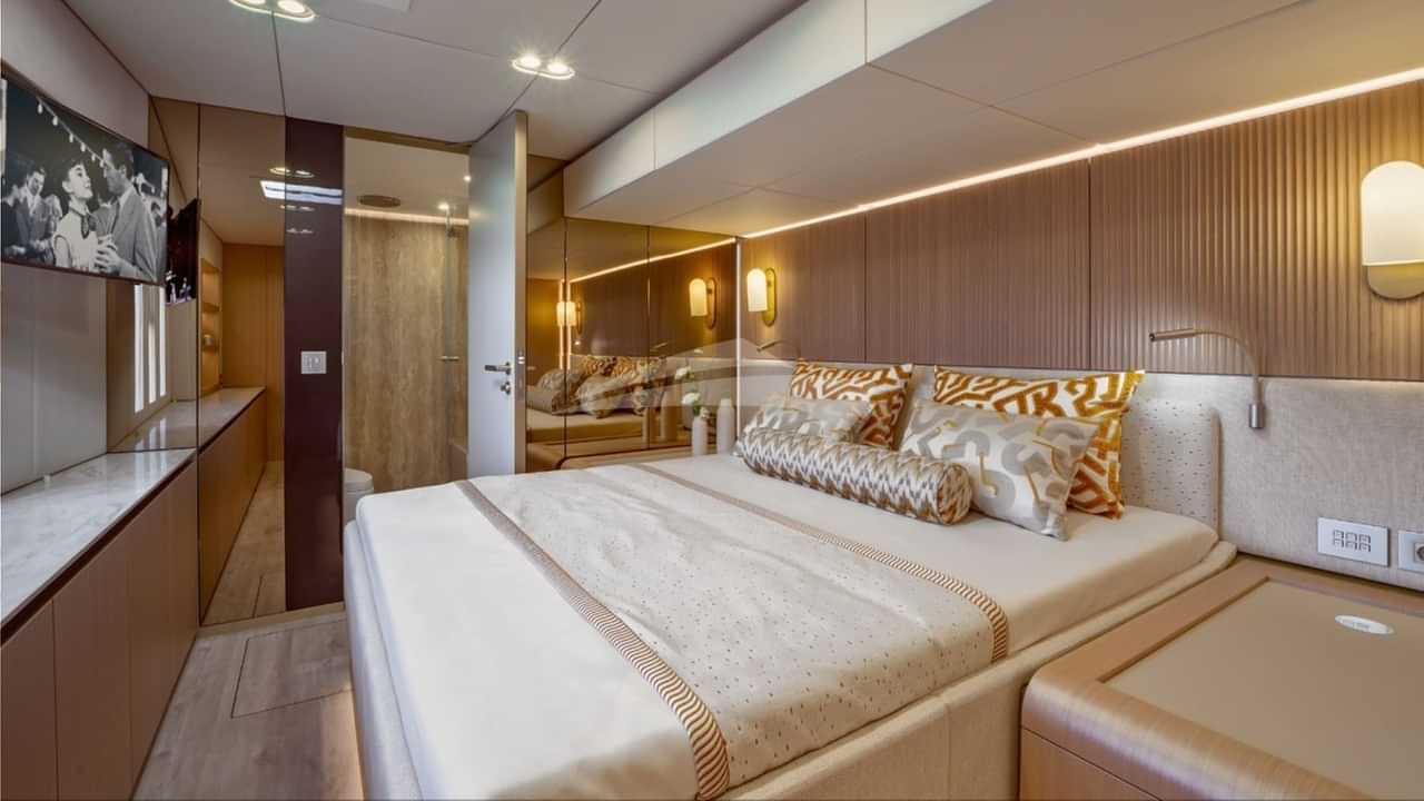 Les équipements à bord pour les clients de la location incluent la climatisation, une plate-forme de baignade, une machine à café, une douche extérieure, une machine à glaçons, un jacuzzi sur le pont, un système audio extérieur, un bar extérieur, une terrasse, des chaises longues, une cabine de télévision principale, un salon de télévision, un dessalinisateur et une connexion Wi-Fi.