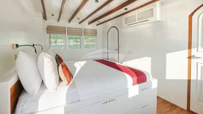 Les cabines d'hôtes comprennent une suite VIP avec un lit double et une salle de bains privative, 2 suites principales avec un lit king size et une salle de bains privative situées sur le pont et 2 suites principales avec un lit king size et une salle de bains privative situées sur le pont.