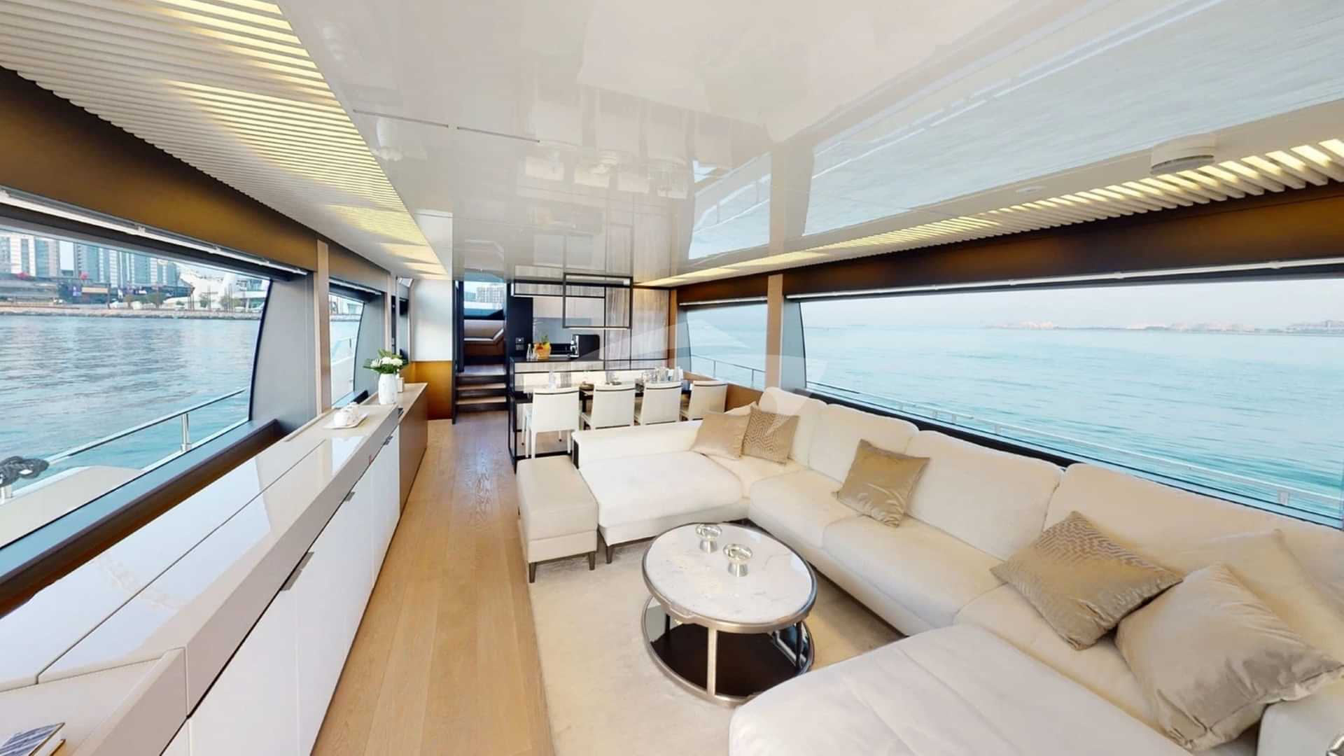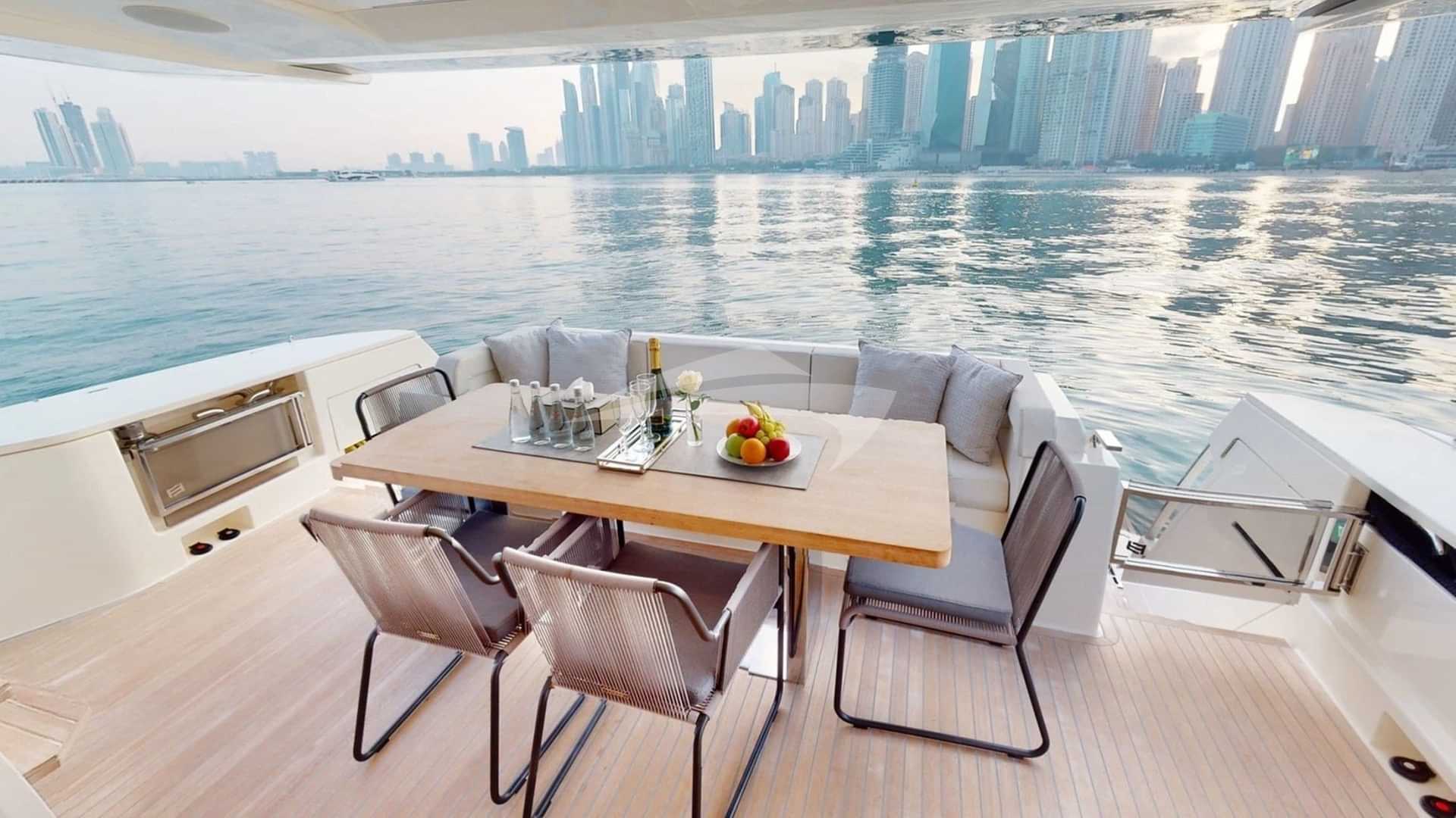 Les équipements à bord pour les clients de la location incluent la climatisation, des coussins de soleil, une terrasse, une plateforme de baignade et une connexion Wi-Fi.