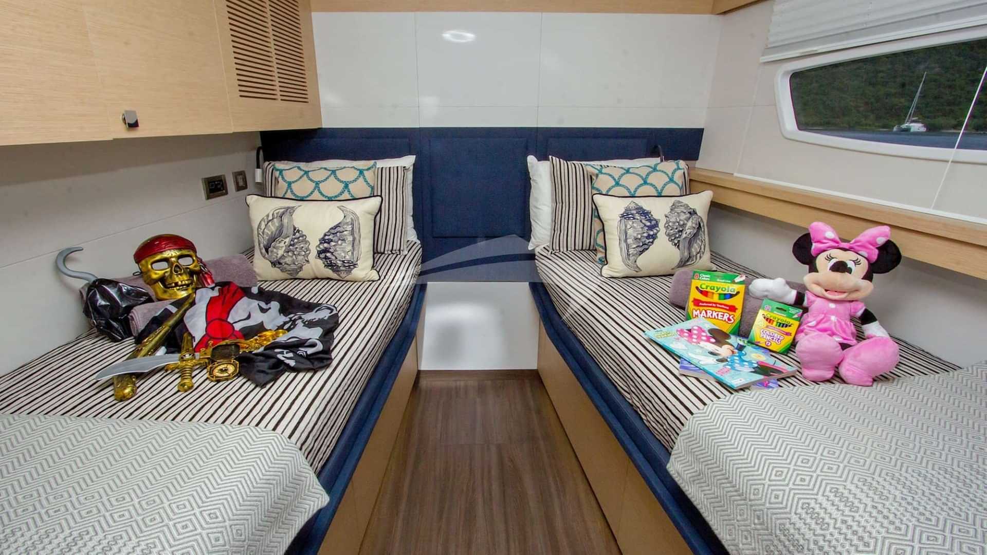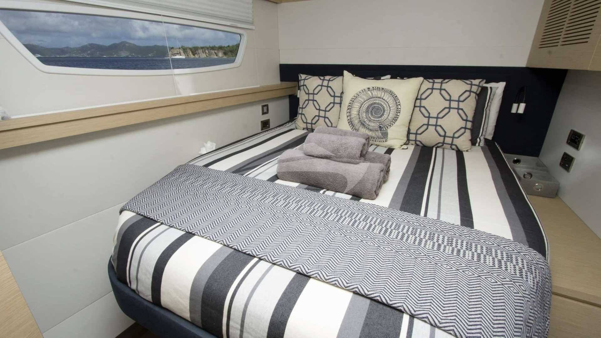 Les cabines comprennent une suite principale avec un lit king-size et une salle de bains privative, 3 cabines avec un lit queen-size et une salle de bains privative, ainsi qu'une cabine avec un lit double et une salle de bains privative.