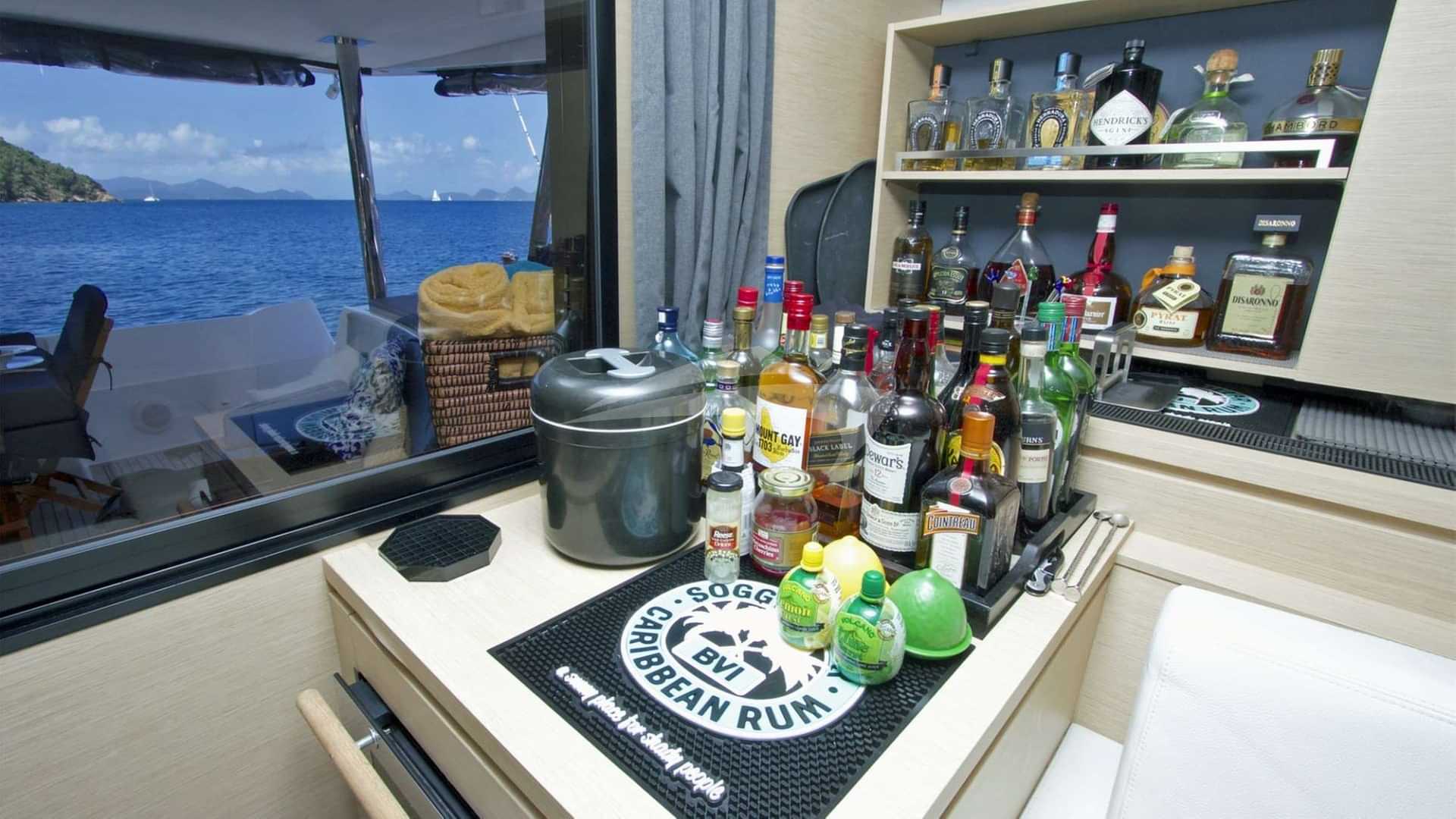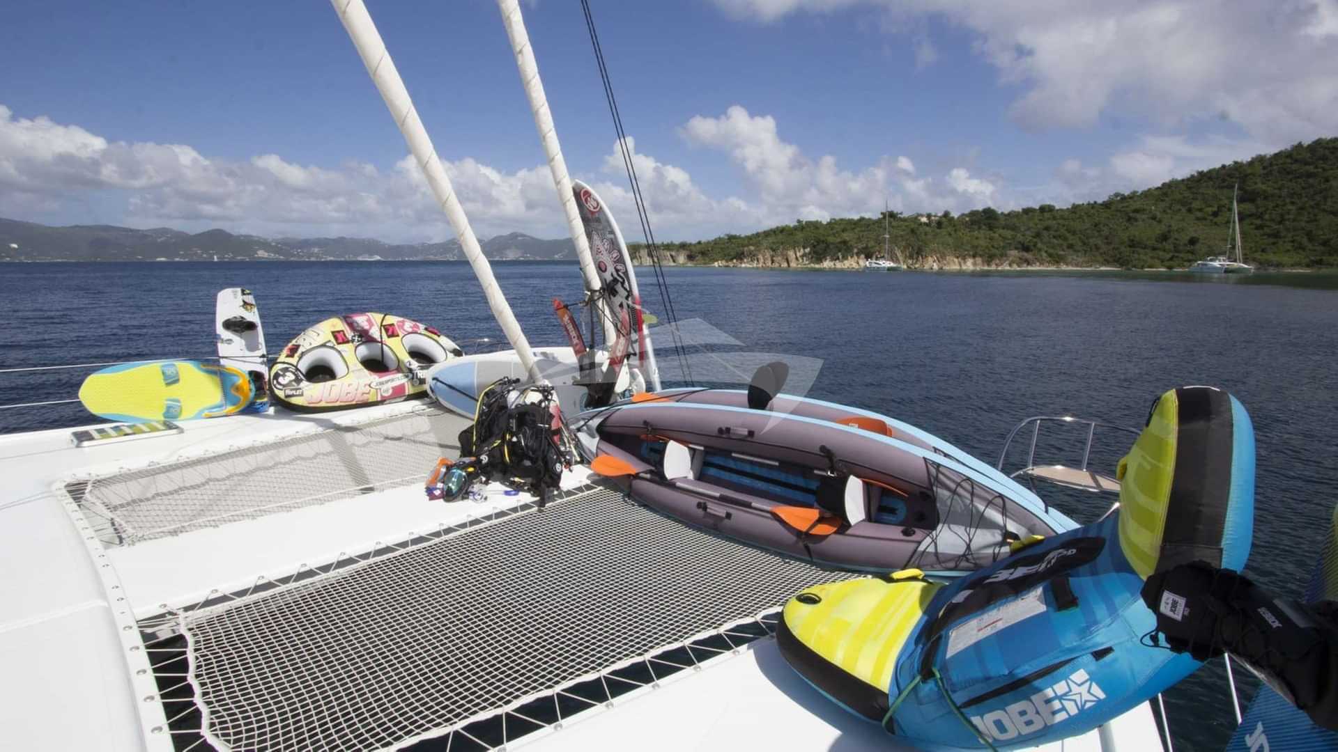 Les équipements à bord pour les clients de la location incluent la climatisation, un barbecue, une douche extérieure, un système audio intérieur, une station d'accueil pour iPod, une plateforme de bain, un salon de télévision et une connexion Wi-Fi.
