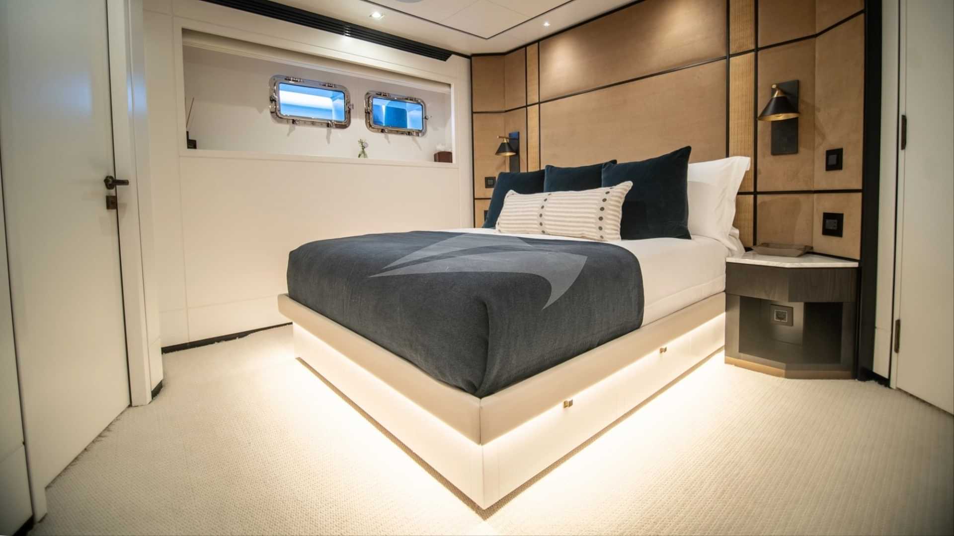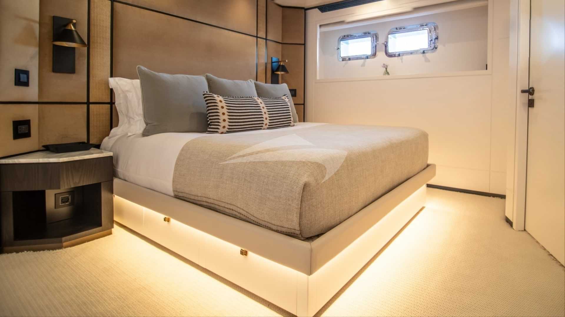 Les cabines d'hôtes comprennent une suite principale avec un lit king size et une salle de bains privative, une suite VIP avec un lit king size et une salle de bains privative, une cabine avec un lit double et une salle de bains privative et 2 cabines avec lits jumeaux et salle de bains privative.