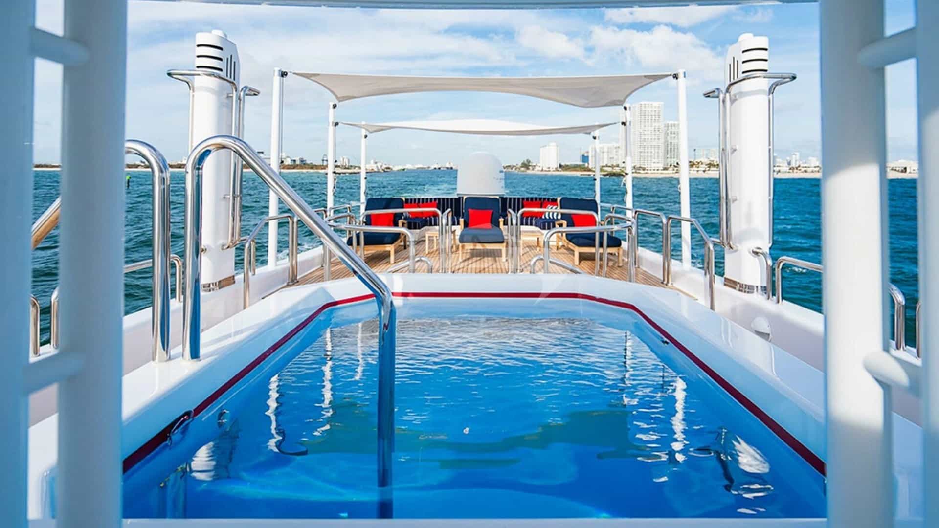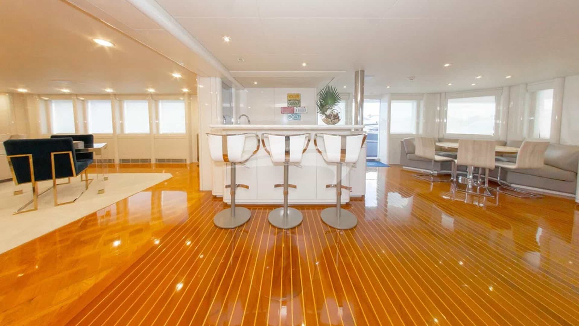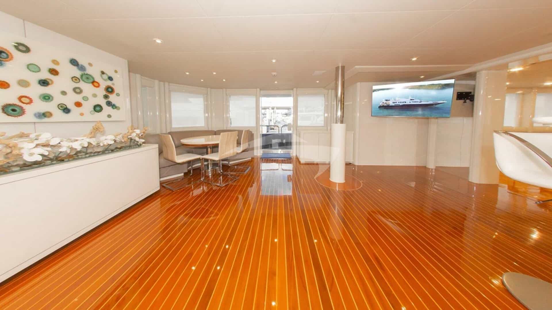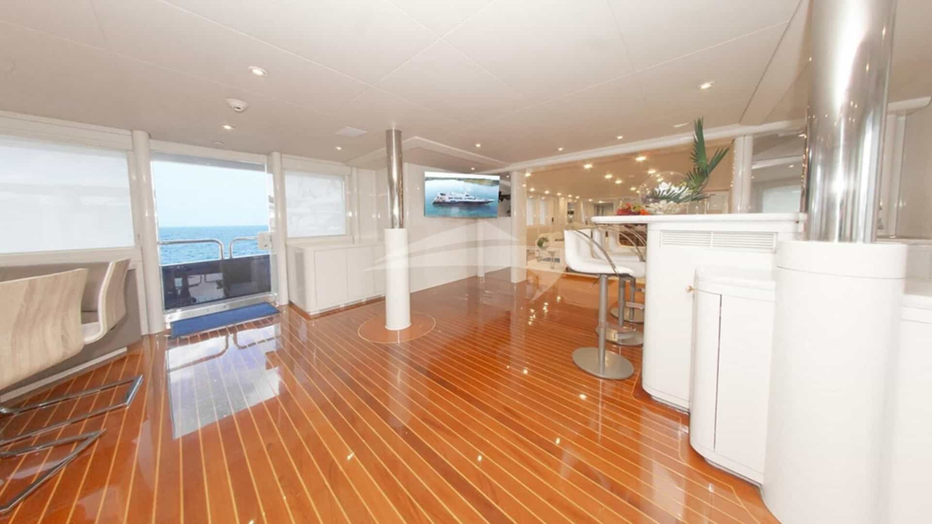 Les équipements à bord pour les clients de la location incluent la climatisation, un barbecue, une douche extérieure, un système audio intérieur, une station d'accueil pour iPod, un jacuzzi sur le pont, une télévision par satellite, un salon de télévision et une connexion Wi-Fi.