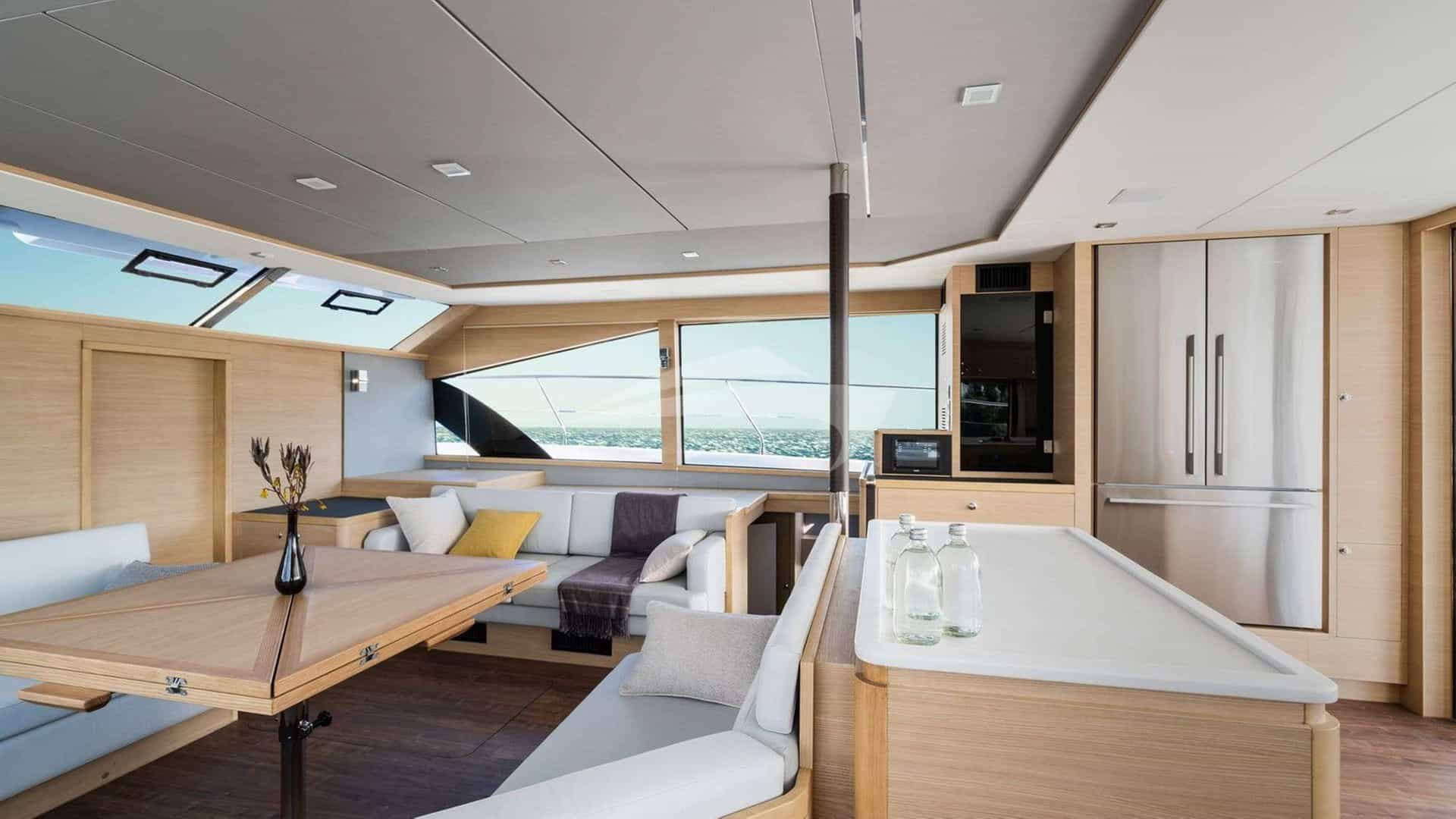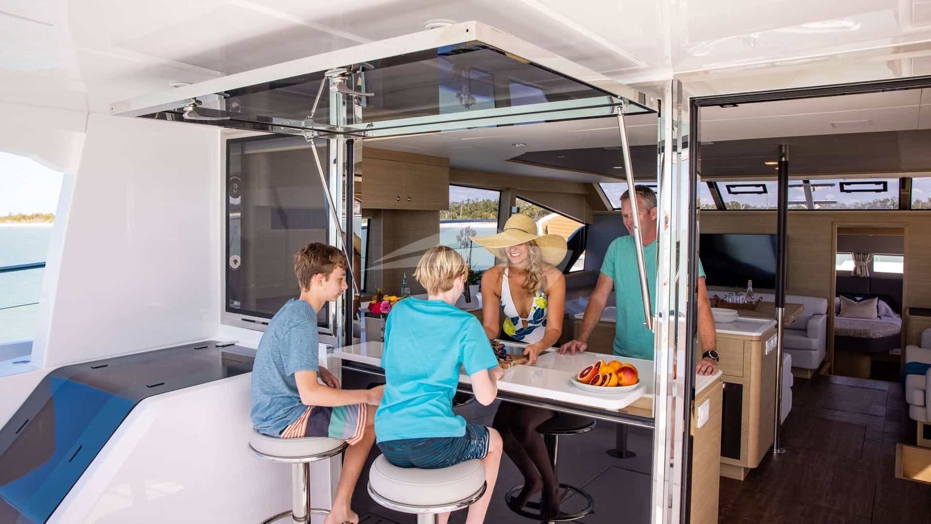 Les équipements à bord pour les clients de la location incluent la climatisation, un barbecue, une douche extérieure, un système audio intérieur, une télévision par satellite, un salon de télévision et une connexion Wi-Fi.