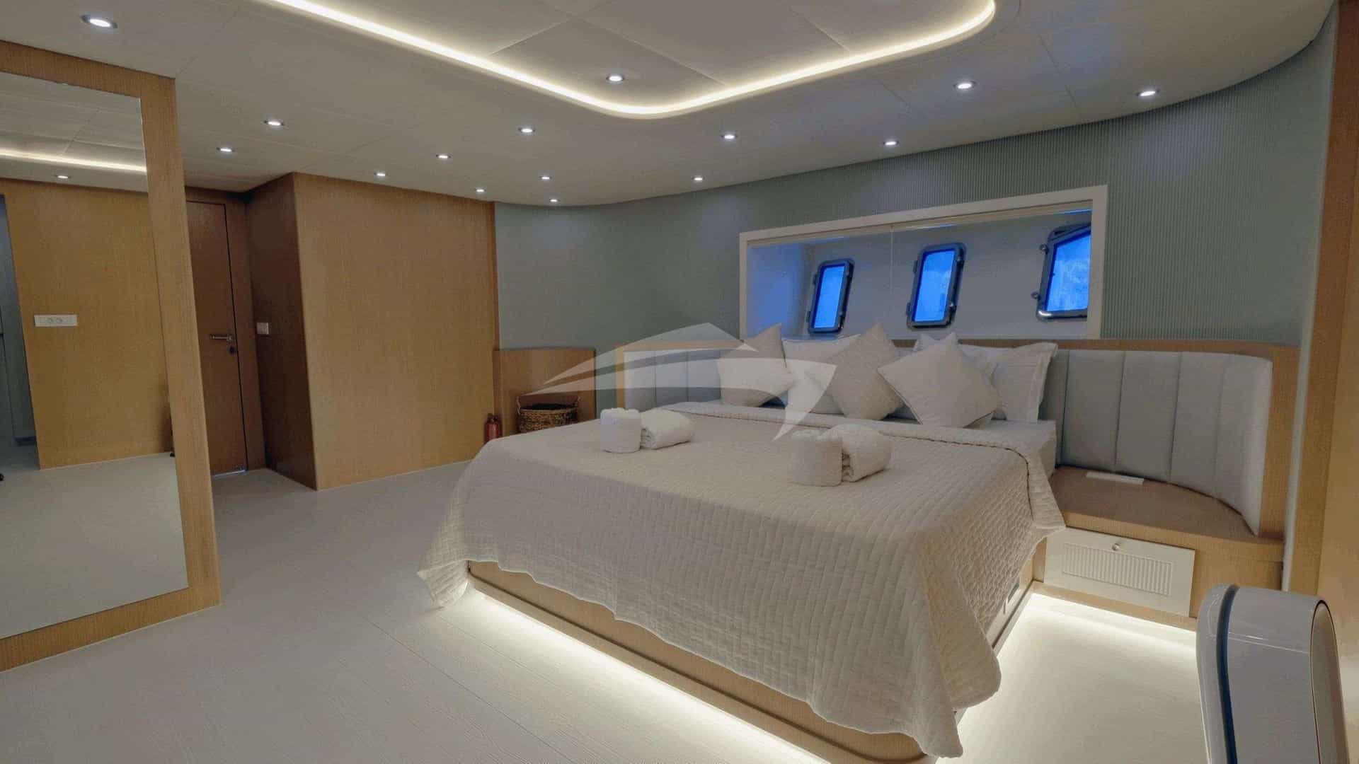 Les cabines d'hôtes comprennent une suite principale avec un lit king-size, une cabine avec un lit king-size, 2 cabines avec un lit double et 2 cabines avec un lit double.