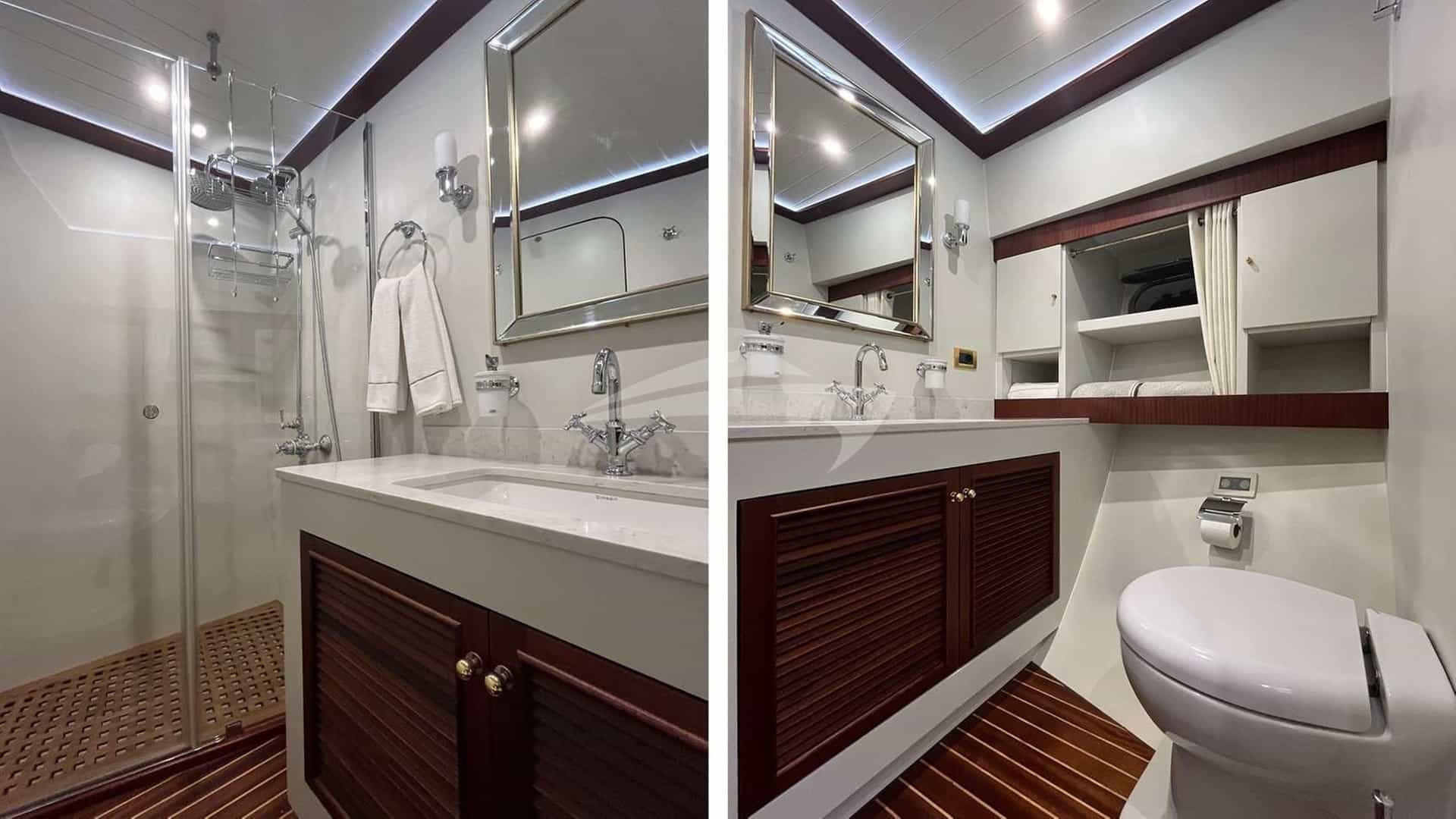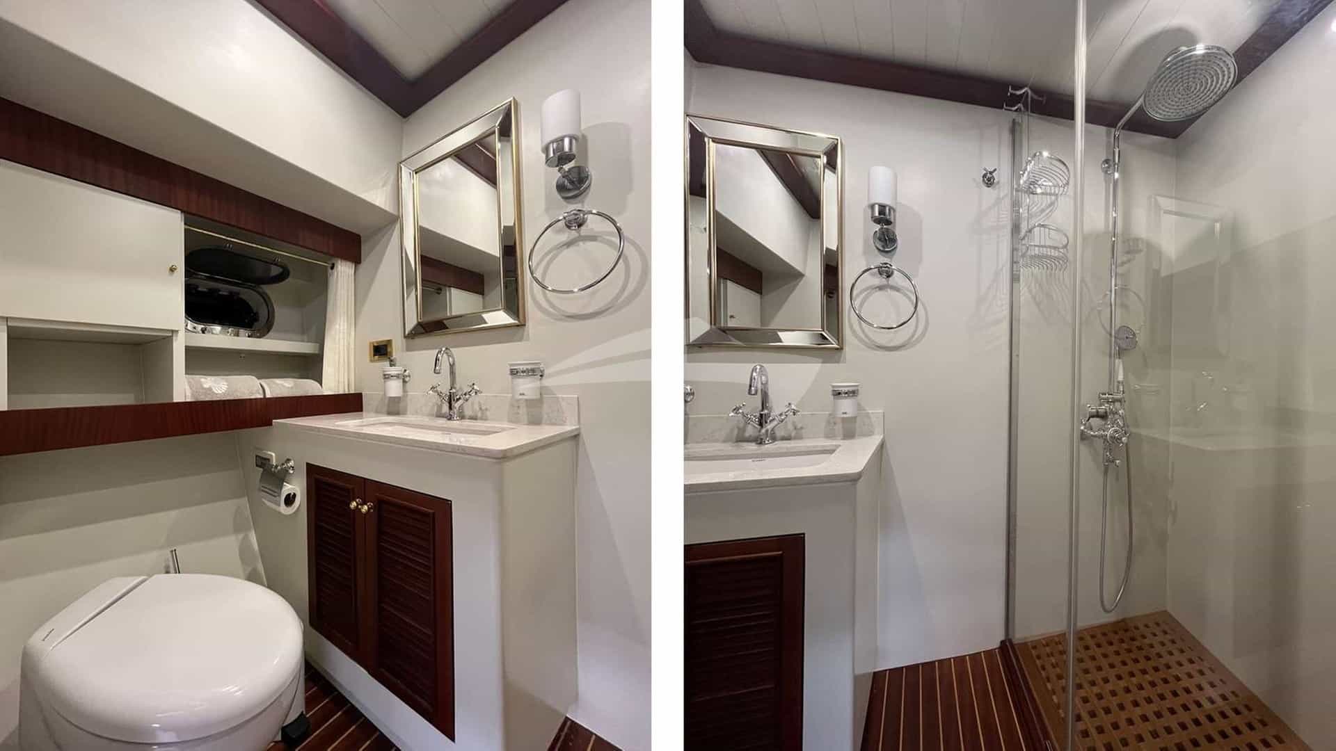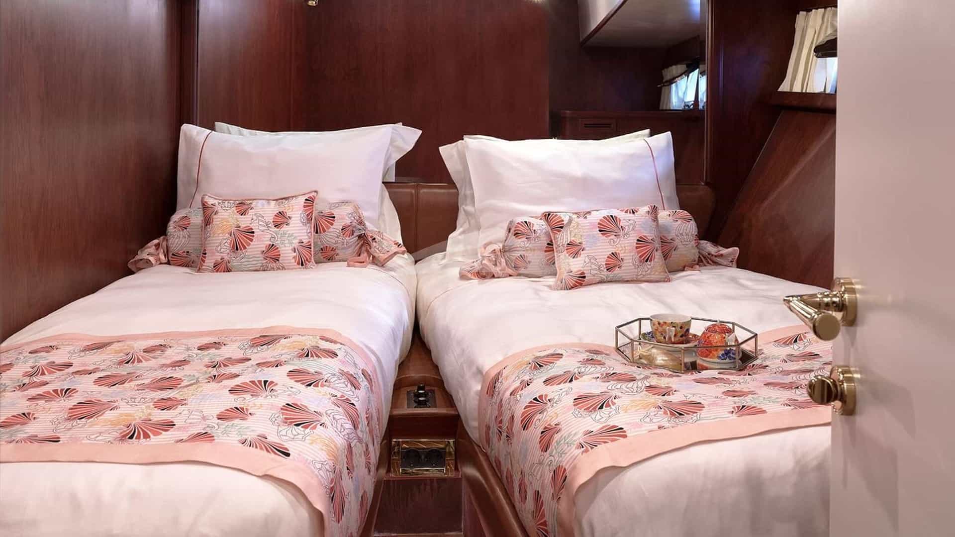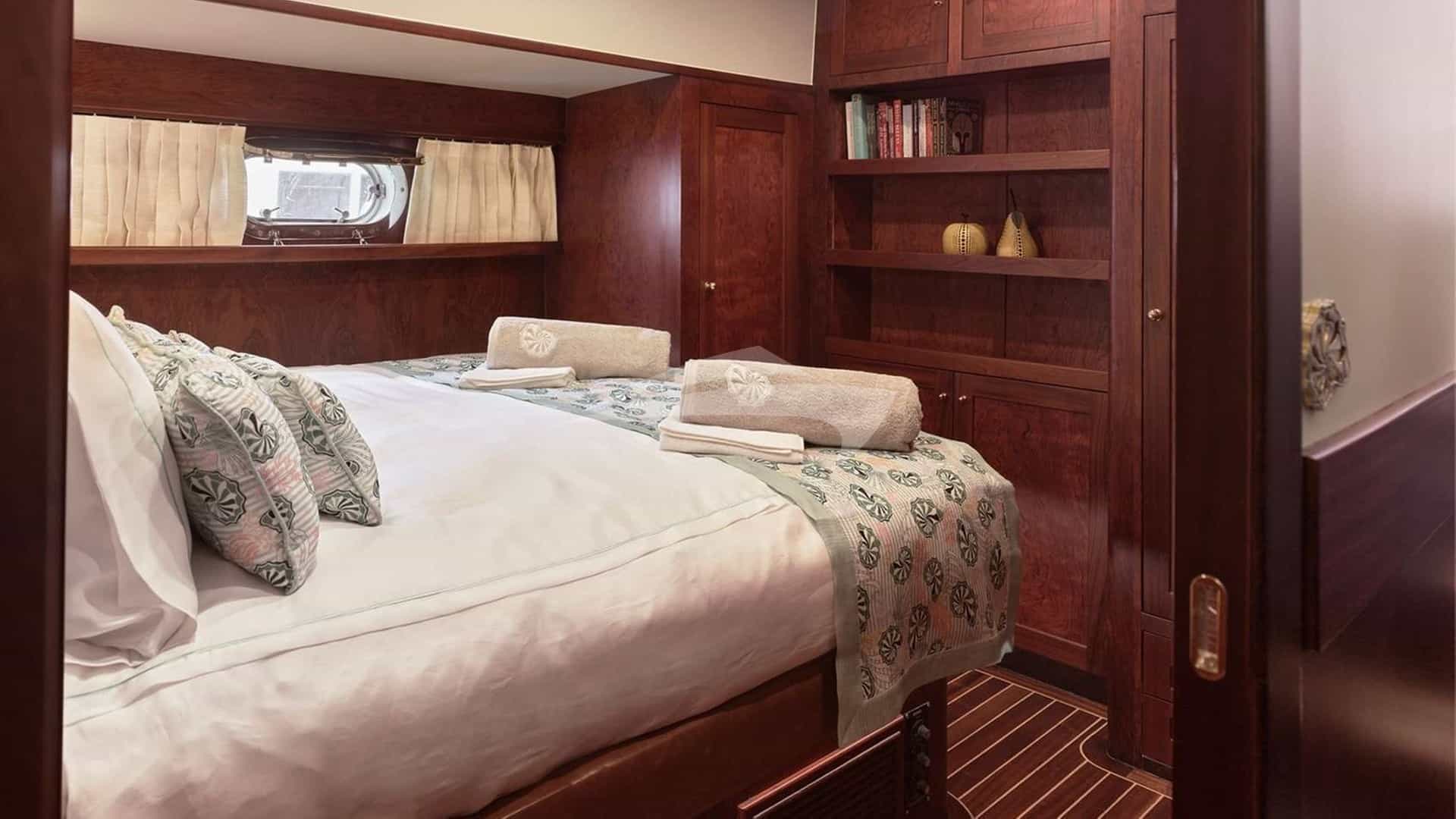Les cabines comprennent une suite principale avec un lit king-size et une salle de bains privative, 2 cabines avec un lit queen-size et une salle de bains privative, ainsi qu'une cabine avec un lit double et une salle de bains privative.