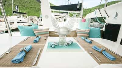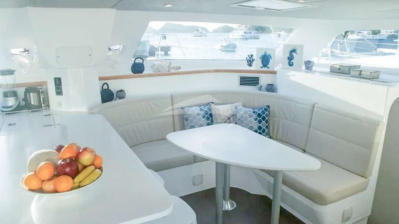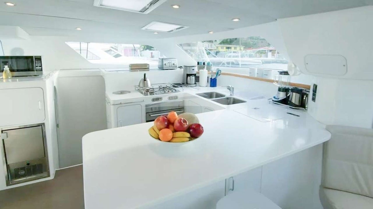Les équipements à bord pour les clients de la location incluent la climatisation, un barbecue, une douche extérieure, un système audio intérieur, une station d'accueil pour iPod, une plateforme de bain et un salon de télévision.