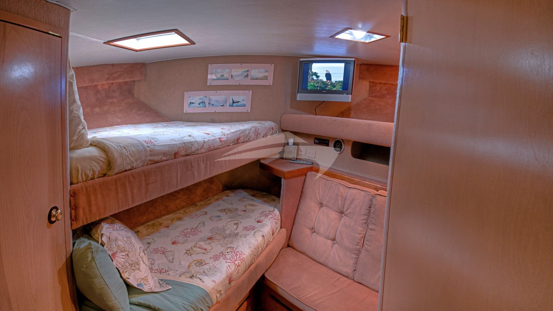 MIDNIGHT SUN peut accueillir 6 personnes dans 3 cabines comprenant une suite principale avec un lit queen-size, un lit simple et une salle de bains privative située à l'avant et 2 cabines avec un lit queen-size et une salle de bains privative.