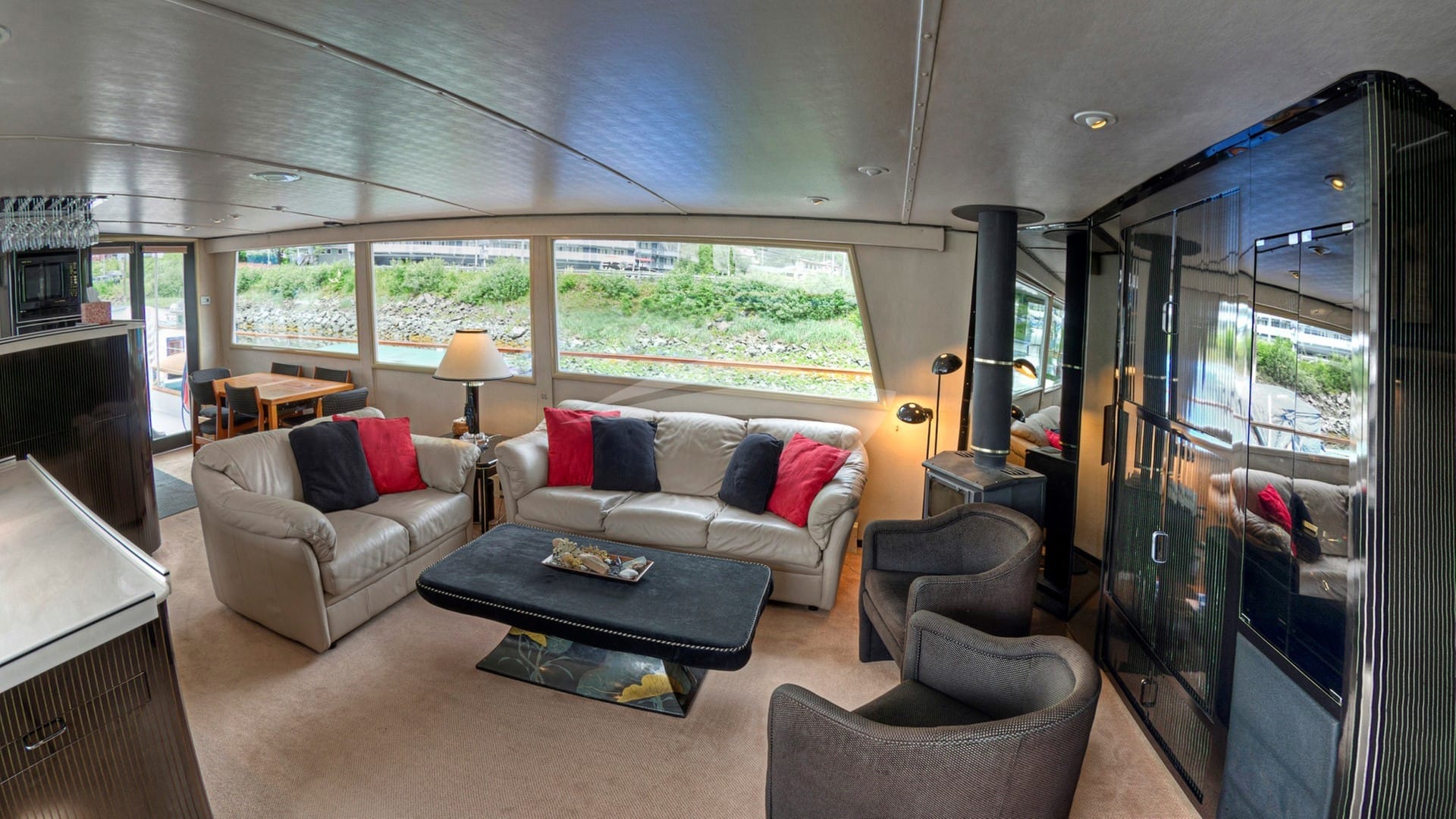 Les équipements à bord incluent du matériel de pêche léger, un système audio intérieur, une station d'accueil pour iPod, une télévision locale, un serveur de films multimédia, des communications par satellite, un salon de télévision et une connexion Wi-Fi.