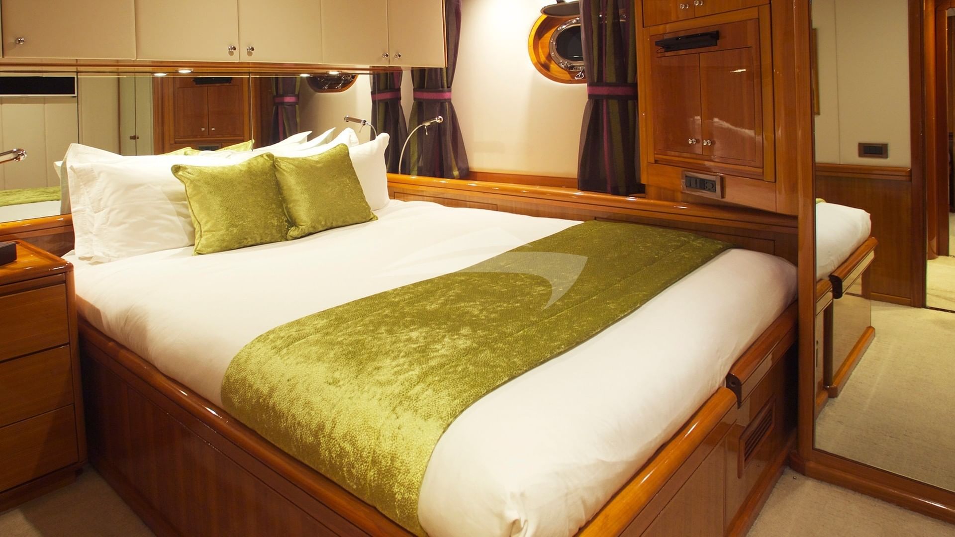 REE peut accueillir 10 personnes dans 5 cabines comprenant une suite principale avec un lit king size et une salle de bains privative située à l'arrière et 4 cabines avec un lit king size et une salle de bains privative.