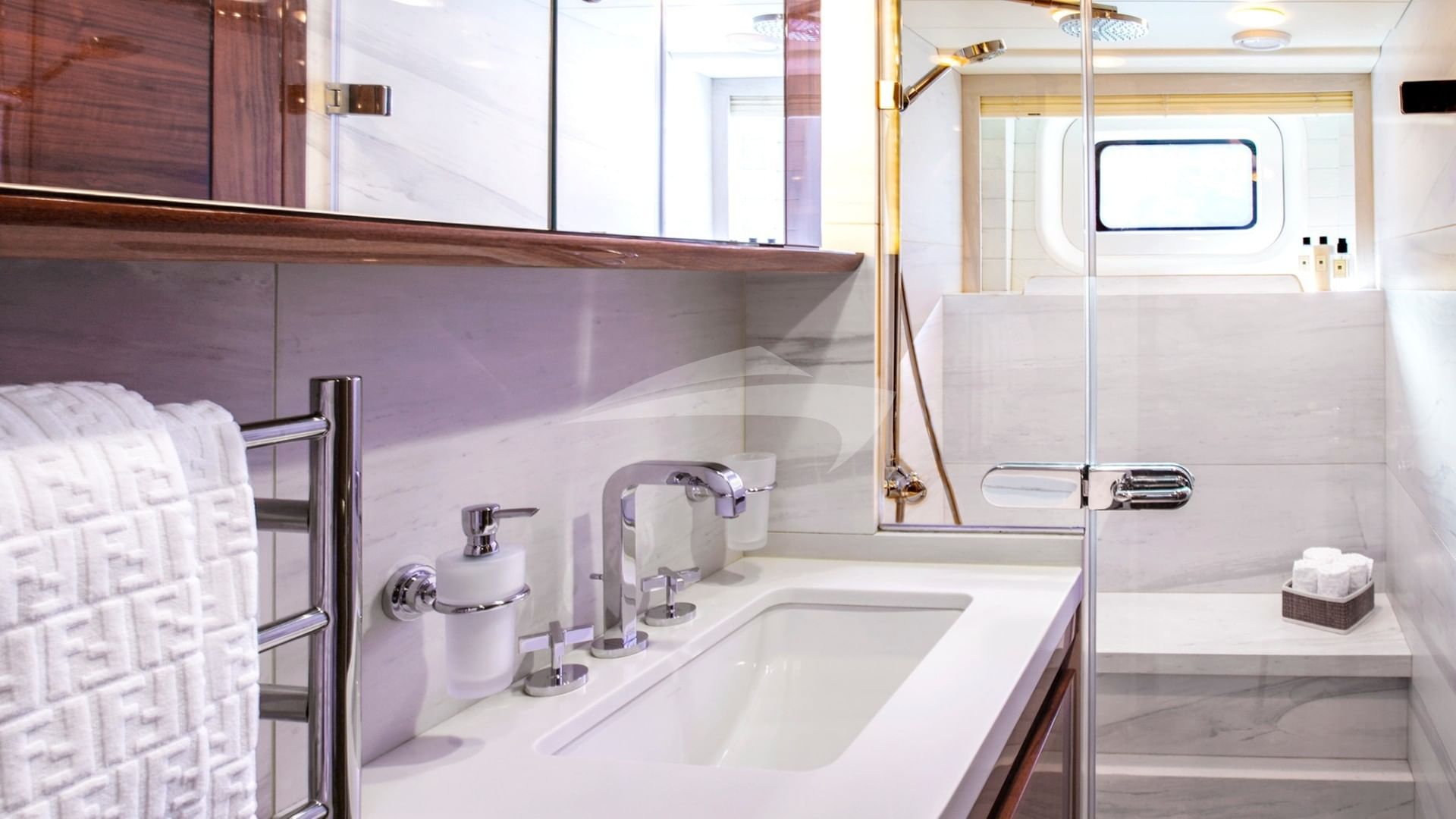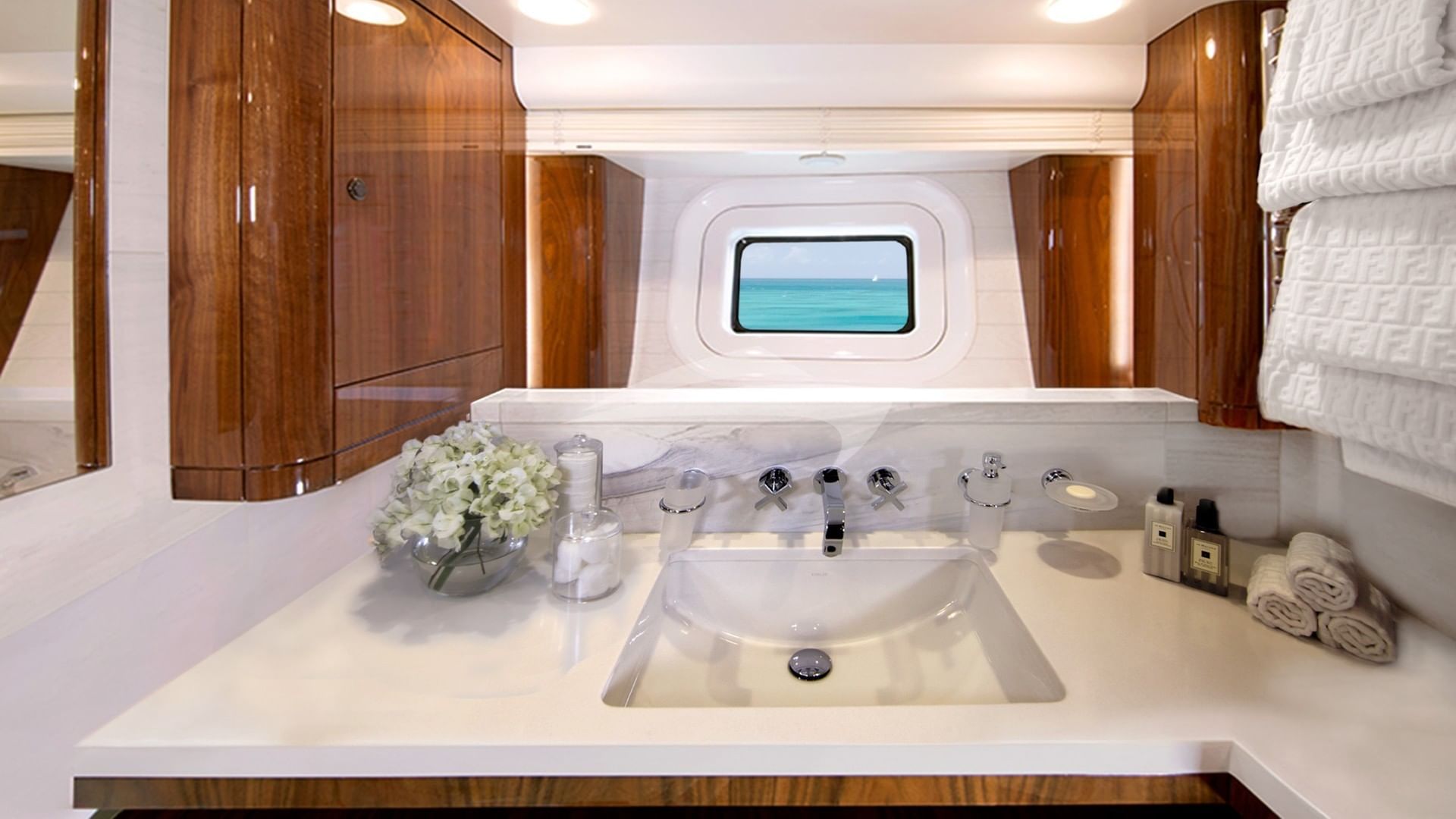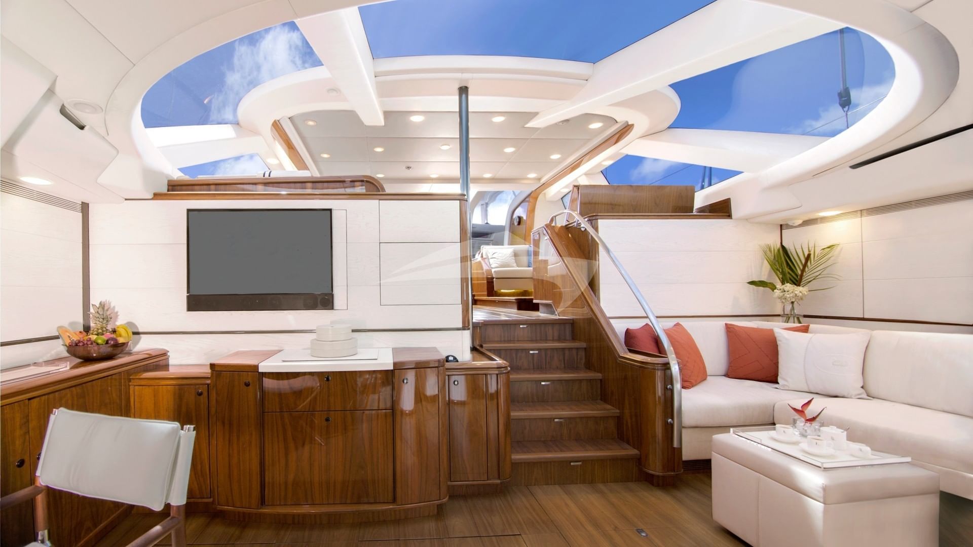 Les équipements à bord incluent la climatisation, une douche extérieure, du matériel de pêche léger, un système audio intérieur, une station d'accueil pour iPod, un serveur de films multimédia, des communications par satellite, des régimes alimentaires spéciaux, une plateforme de baignade et une connexion Wi-Fi.