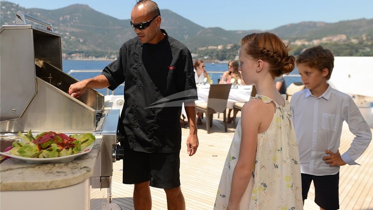 Les équipements à bord incluent la climatisation, un barbecue, une piste de danse, des équipements d'exercice, du matériel de pêche léger, une salle de sport, un jacuzzi sur le pont, un serveur de films multimédia, une télévision par satellite, des stabilisateurs au mouillage et une connexion Wi-Fi.