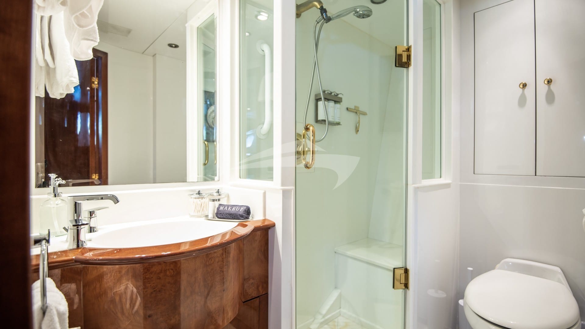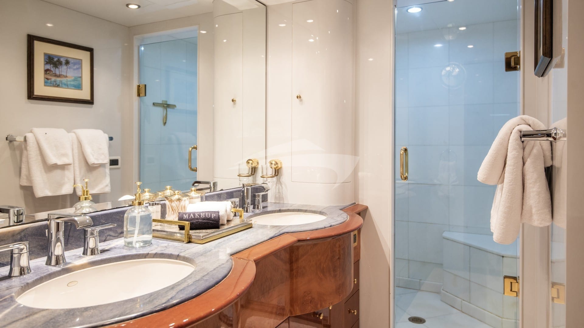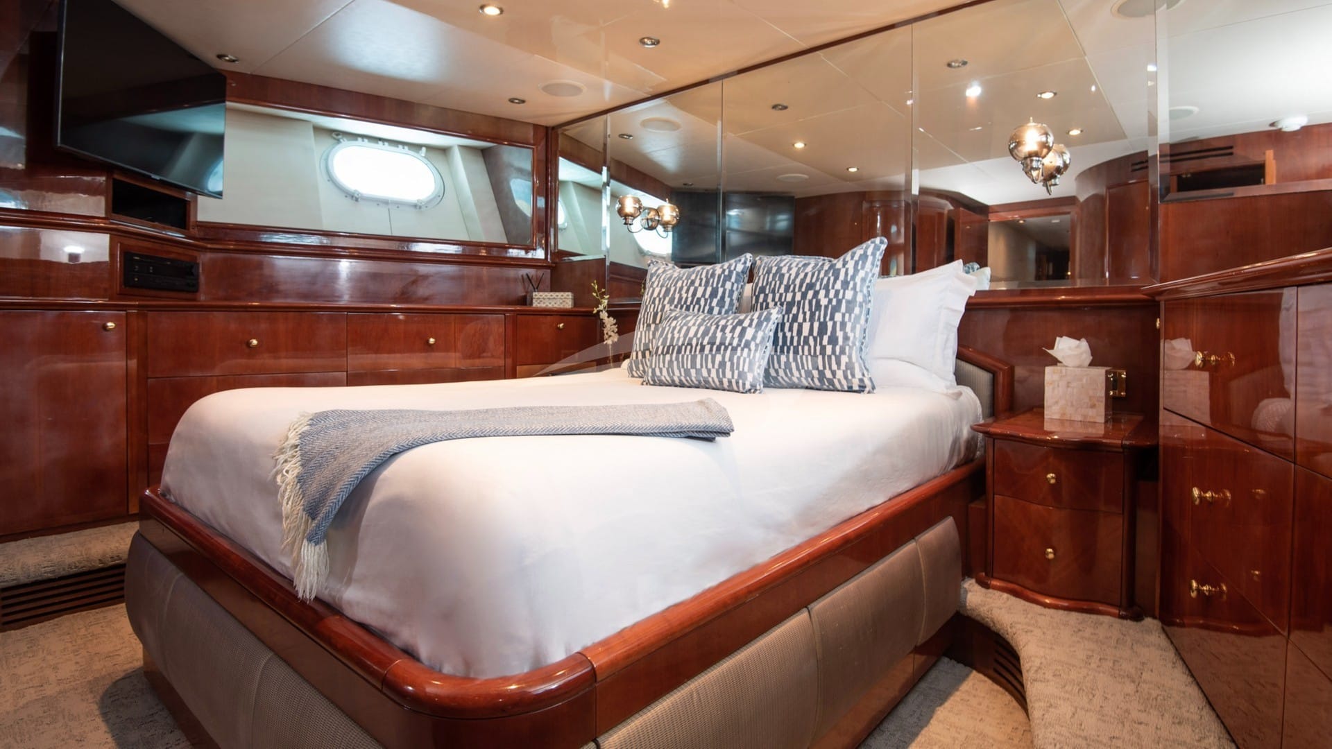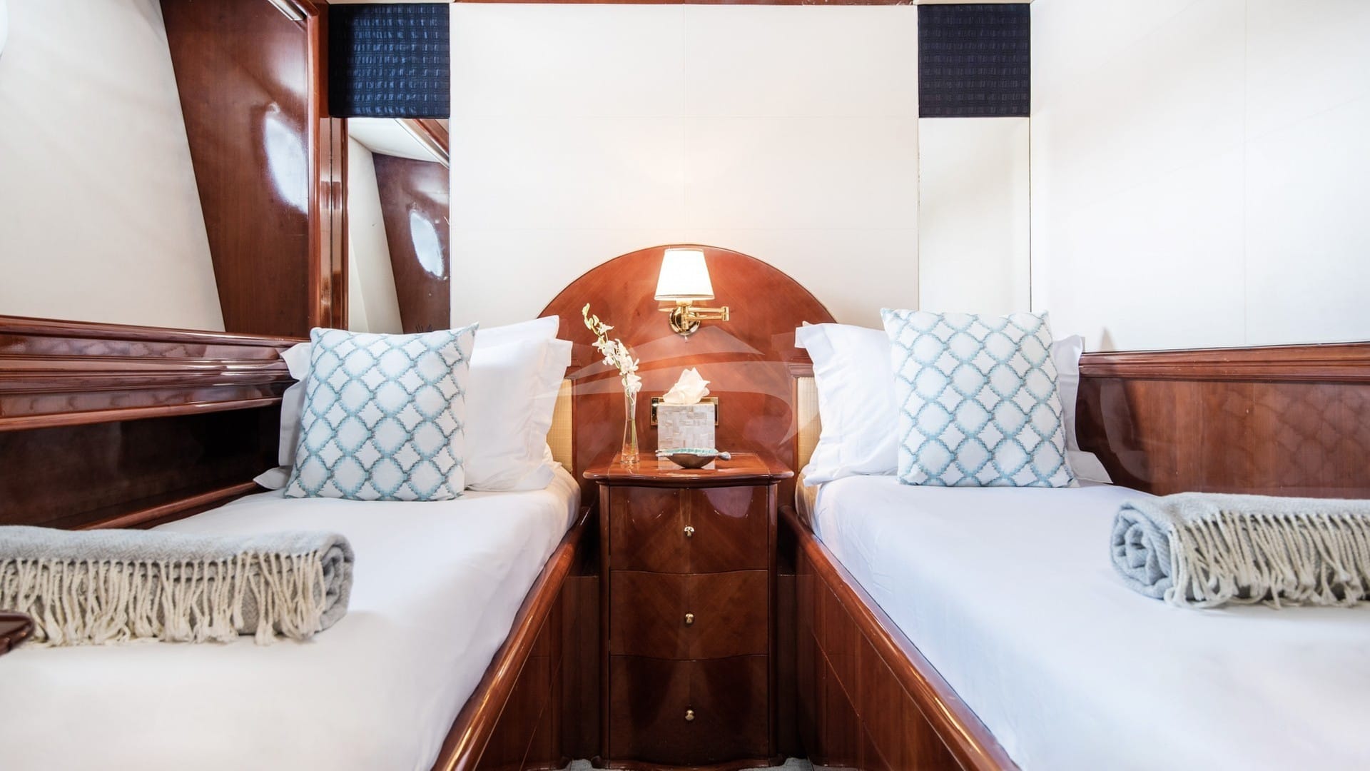 Les cabines comprennent une suite principale avec un lit king-size et une salle de bains privative située sous le pont arrière, une suite VIP avec un lit queen-size et une salle de bains privative, ainsi que 2 cabines avec un lit double et une salle de bains privative.