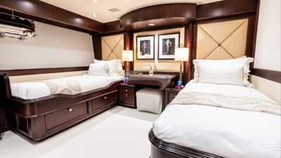 Les cabines comprennent une suite principale avec un lit king-size et une salle de bains privative située sur le pont, 3 cabines avec un lit queen-size et une salle de bains privative, ainsi qu'une cabine avec un lit double et une salle de bains privative.