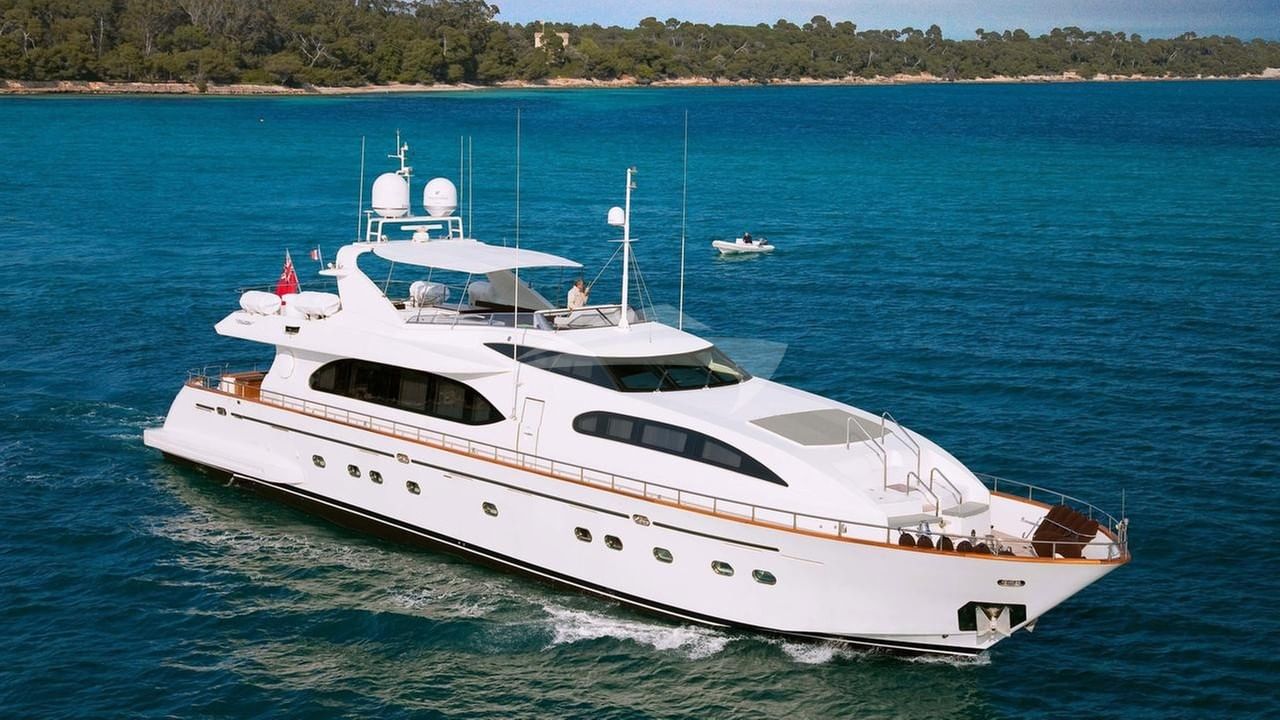 Le YLANG YLANG YLANG de 103 pieds/31,5 m a été construit avec une coque en grp et est propulsé par M.T.U. 16V 2000 avec une vitesse de croisière de 23 nœuds.