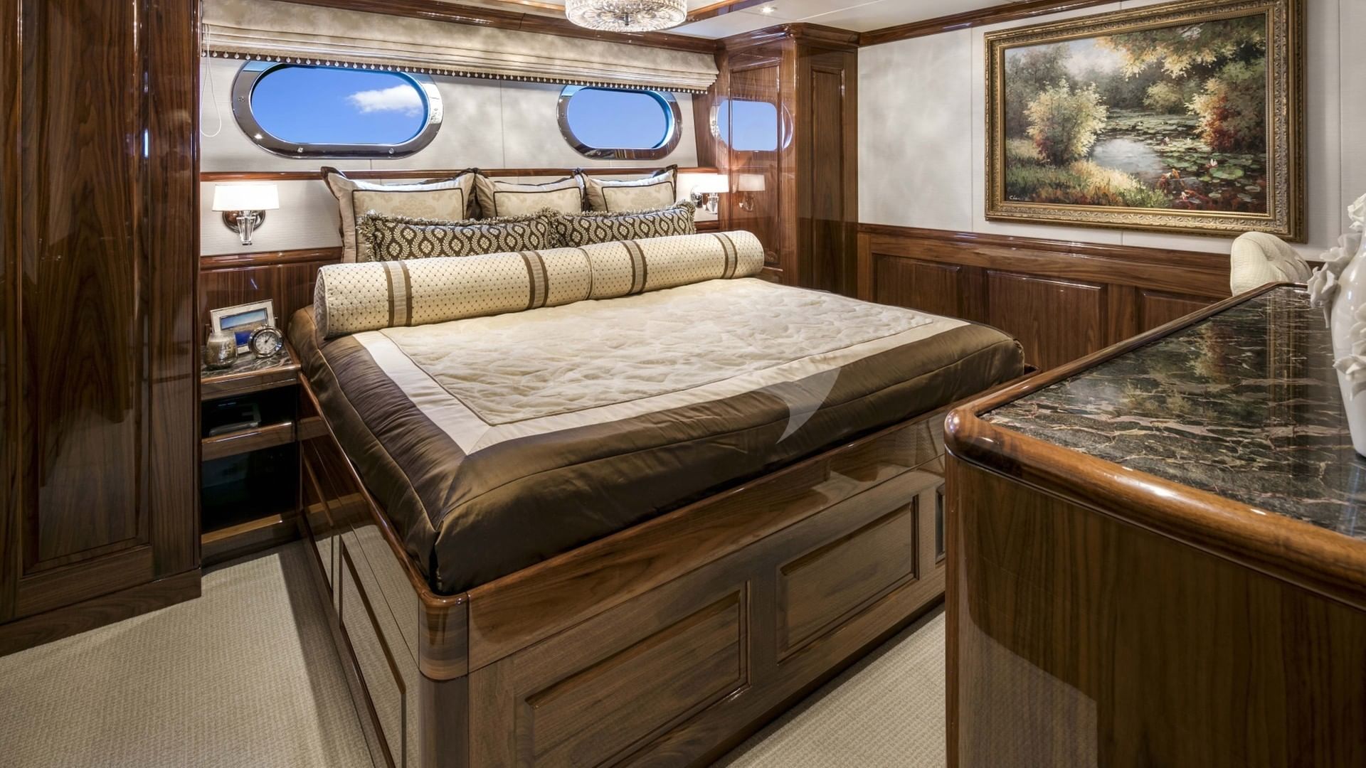 Les cabines d'hôtes comprennent une suite VIP avec un lit king-size et une salle de bains privative, 2 cabines avec un lit double et une salle de bains privative, 2 cabines avec un lit king-size et une salle de bains privative, ainsi qu'une suite primaire avec un lit king-size et une salle de bains privative située sur le principal pont.