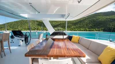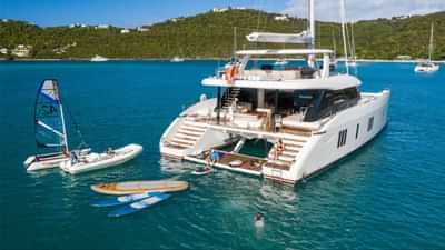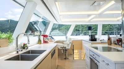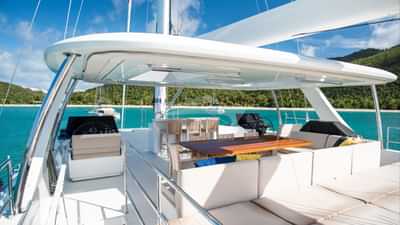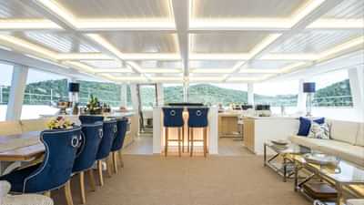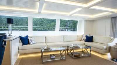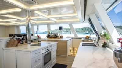 Les équipements à bord pour les clients de la location incluent la climatisation, un barbecue, une douche extérieure, des équipements d'exercice, du matériel de pêche léger, un système audio intérieur, un système audio extérieur, des coussins solaires, une plateforme de bain, un salon de télévision et un dessalinisateur.