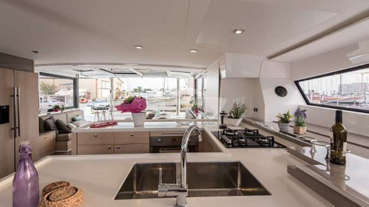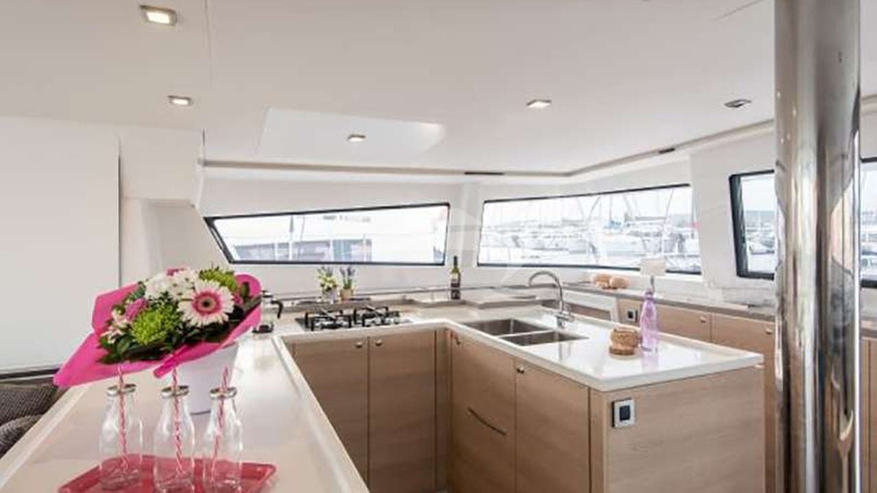 I servizi a bordo per gli ospiti charter includono aria condizionata, barbecue, doccia esterna, impianto audio interno, docking station per iPod, piattaforma da nuoto, sala TV e Wi-Fi.