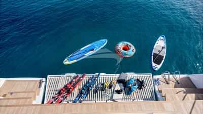 I servizi a bordo per gli ospiti charter includono aria condizionata, doccia esterna, attrezzatura da pesca leggera, impianto audio interno, sistema audio esterno, piattaforma da nuoto, sala TV, dissalone TV, dissalatore e Wi-Fi.