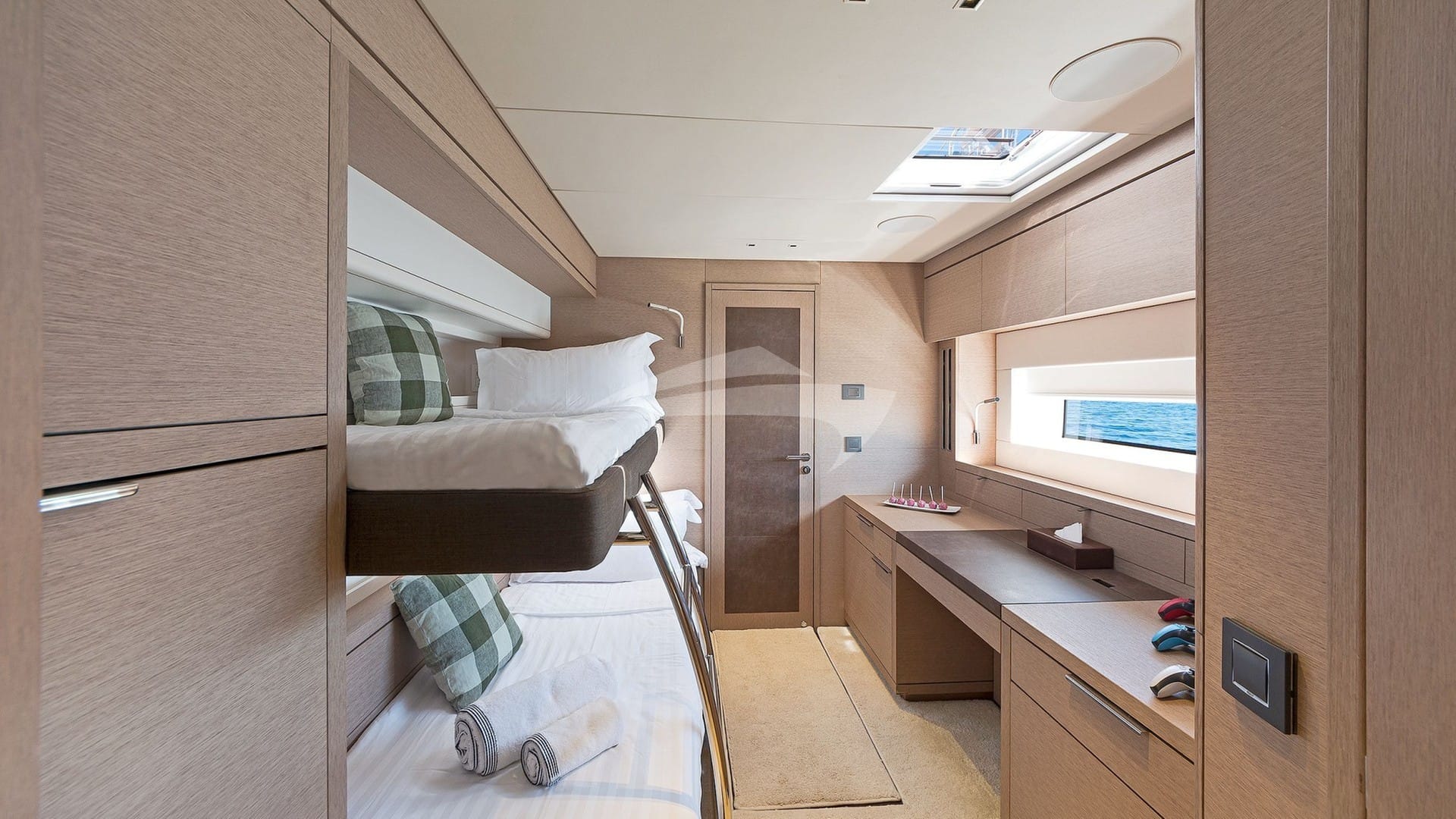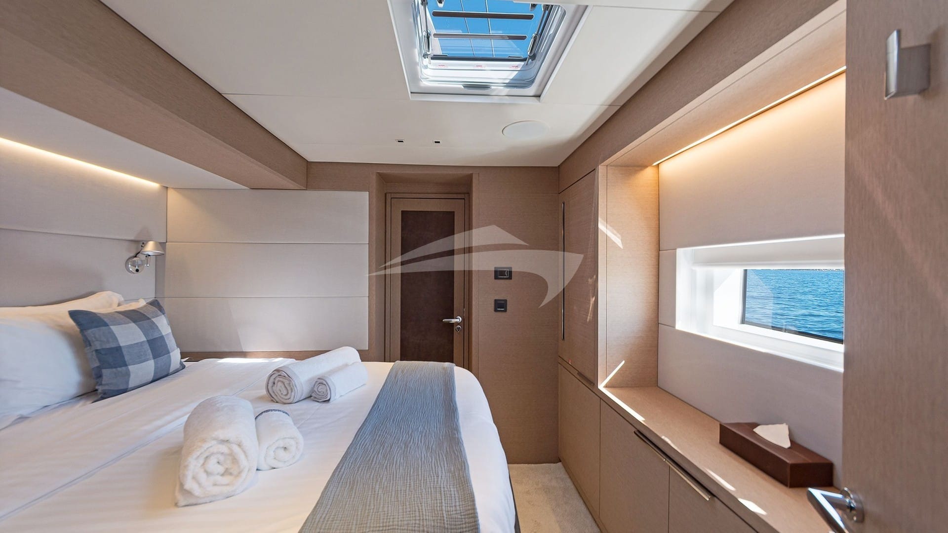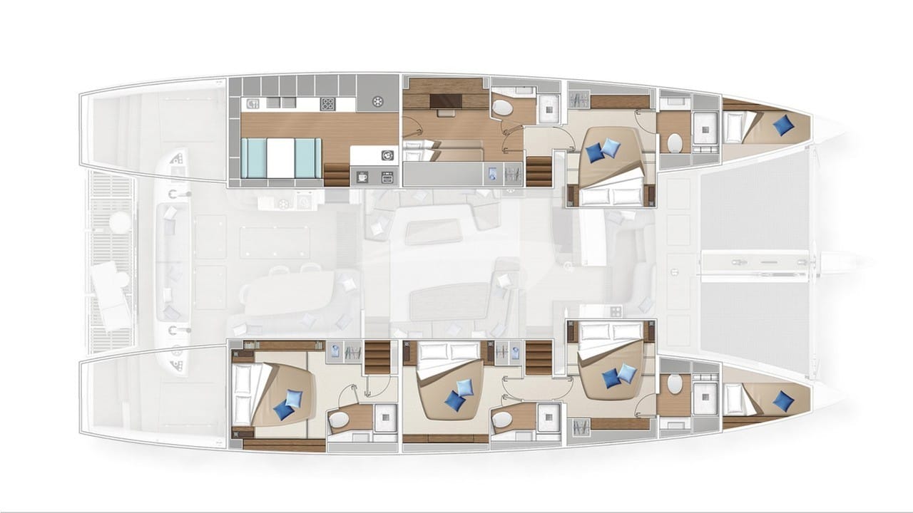 Le cabine ospiti comprendono una suite principale con letto matrimoniale e bagno interno, una suite VIP con letto matrimoniale e bagno interno, 2 cabine con letto matrimoniale e bagno interno e una cabina con 2 letti singoli e bagno interno.