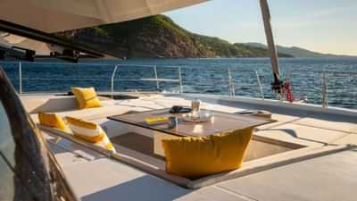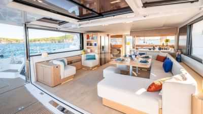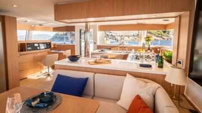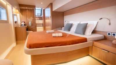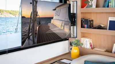 I servizi a bordo includono aria condizionata, barbecue, doccia esterna, impianto audio interno, docking station per iPod, sala TV e Wi-Fi.