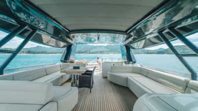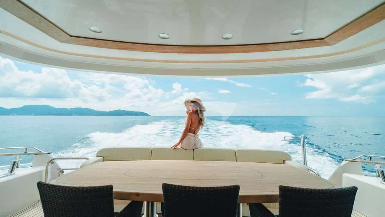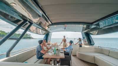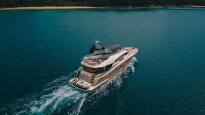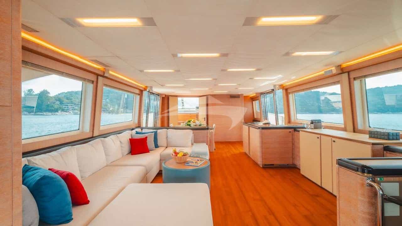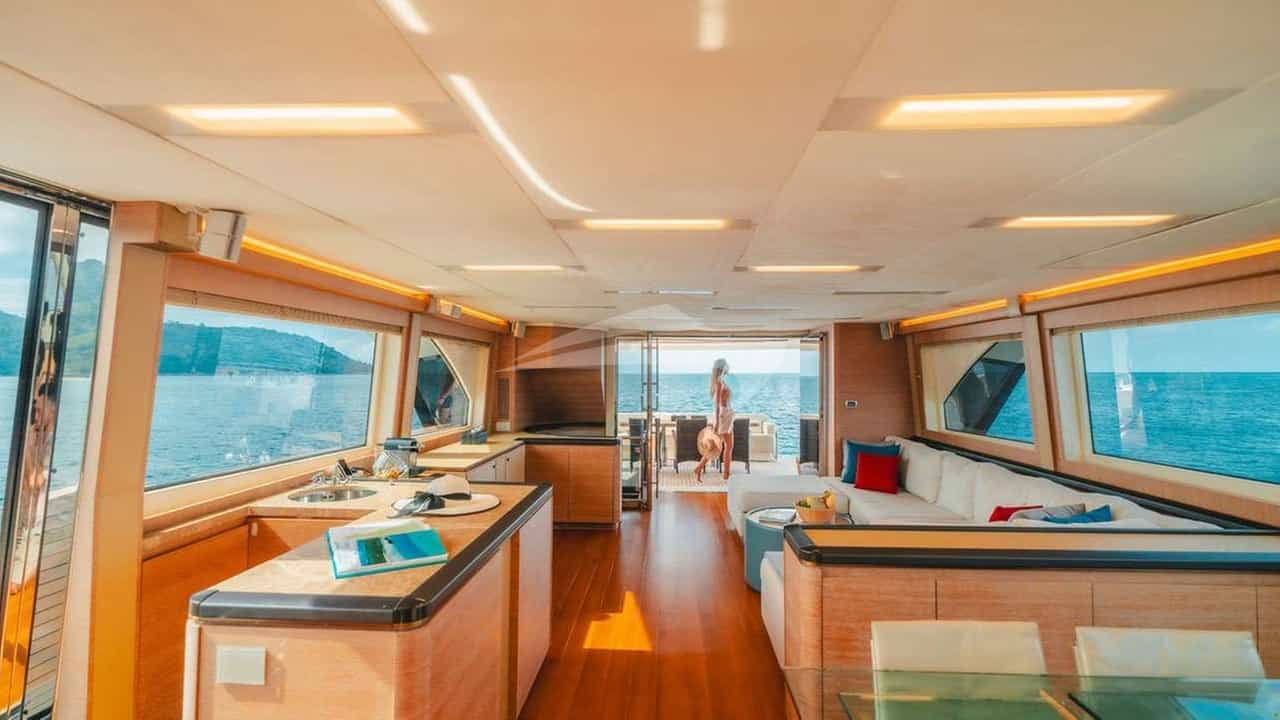 I servizi a bordo per gli ospiti charter includono aria condizionata, barbecue, doccia esterna, sistema audio interno, stabilizzatori all'ancora, piattaforma da nuoto, sala TV e Wi-Fi.