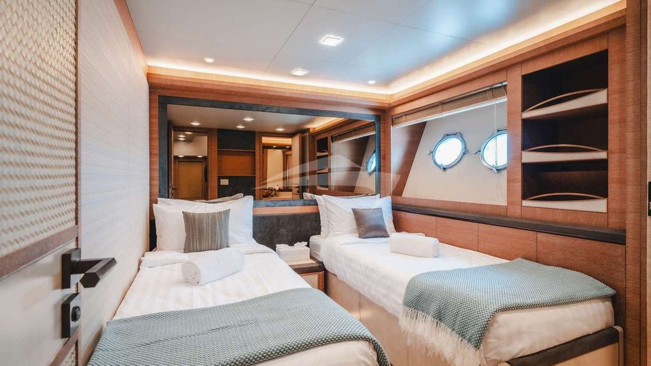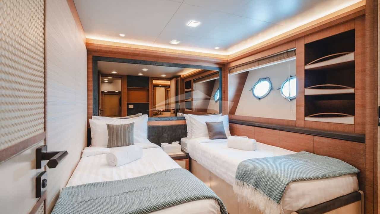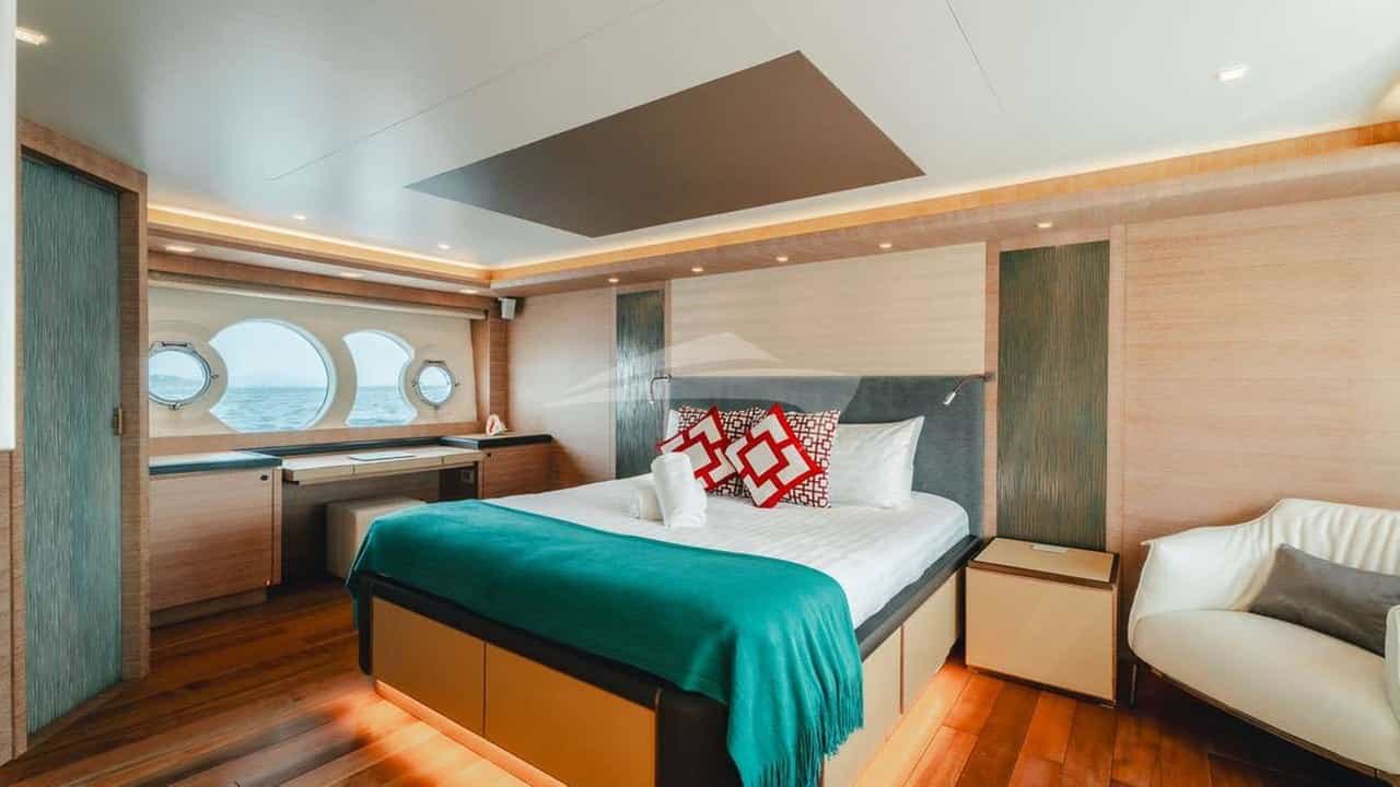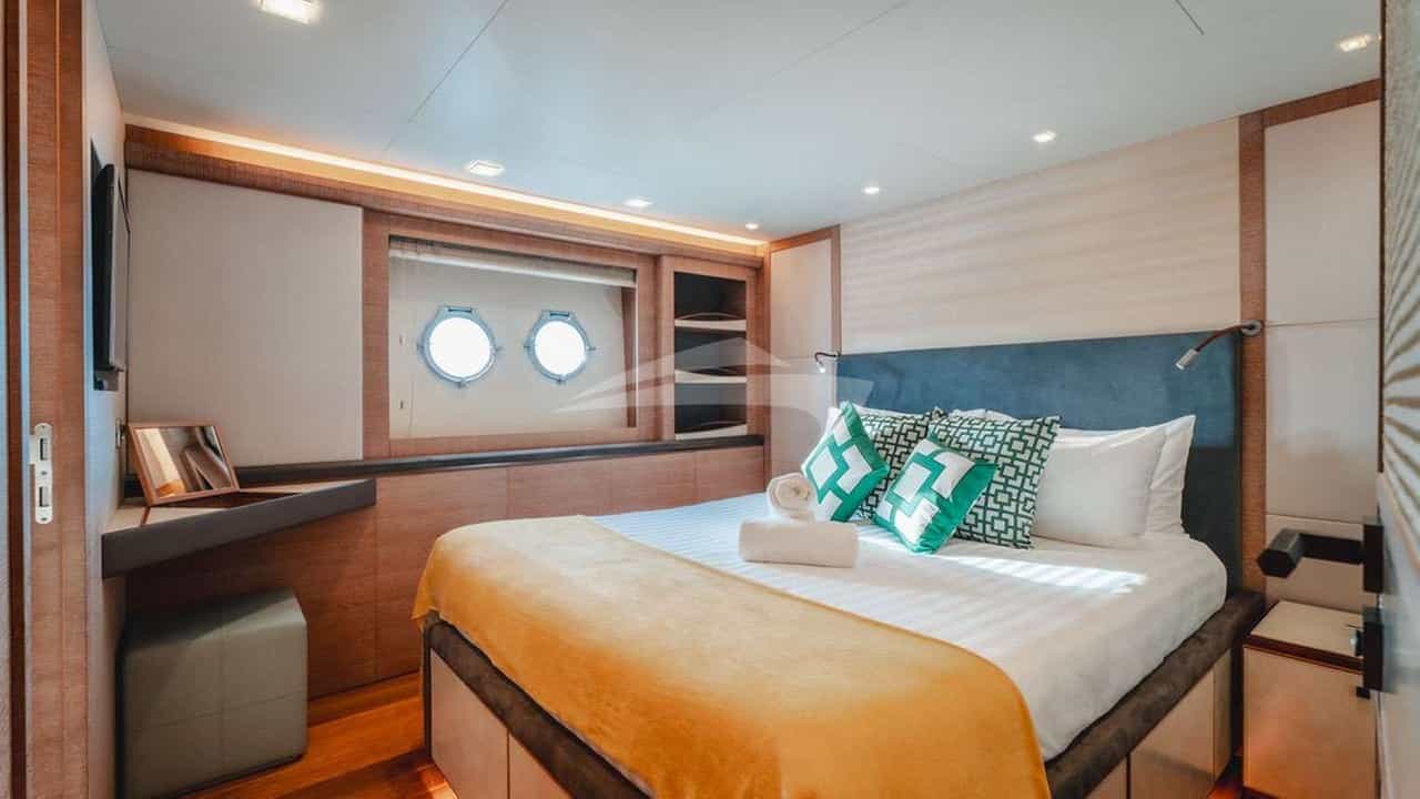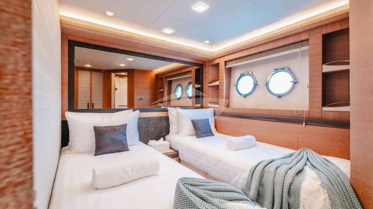 Le cabine ospiti comprendono una suite principale con letto king size e bagno privato, una cabina con letto matrimoniale e bagno privato, 2 cabine con letto matrimoniale e bagno privato e 2 cabine con letto singolo.