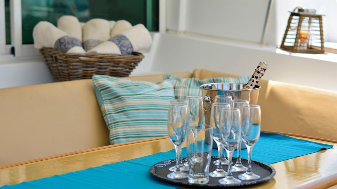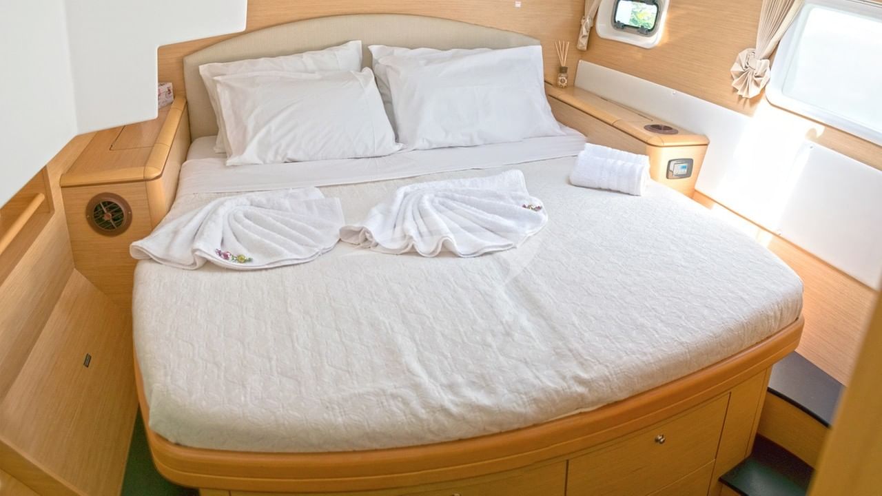 INFINITY può ospitare 10 persone in 5 cabine composte da una suite principale con letto queen size e bagno interno, una suite VIP con letto queen size e bagno interno, 2 cabine con letto queen size e bagno interno e una cabina con 2 letti singoli e bagno interno. bagno.
